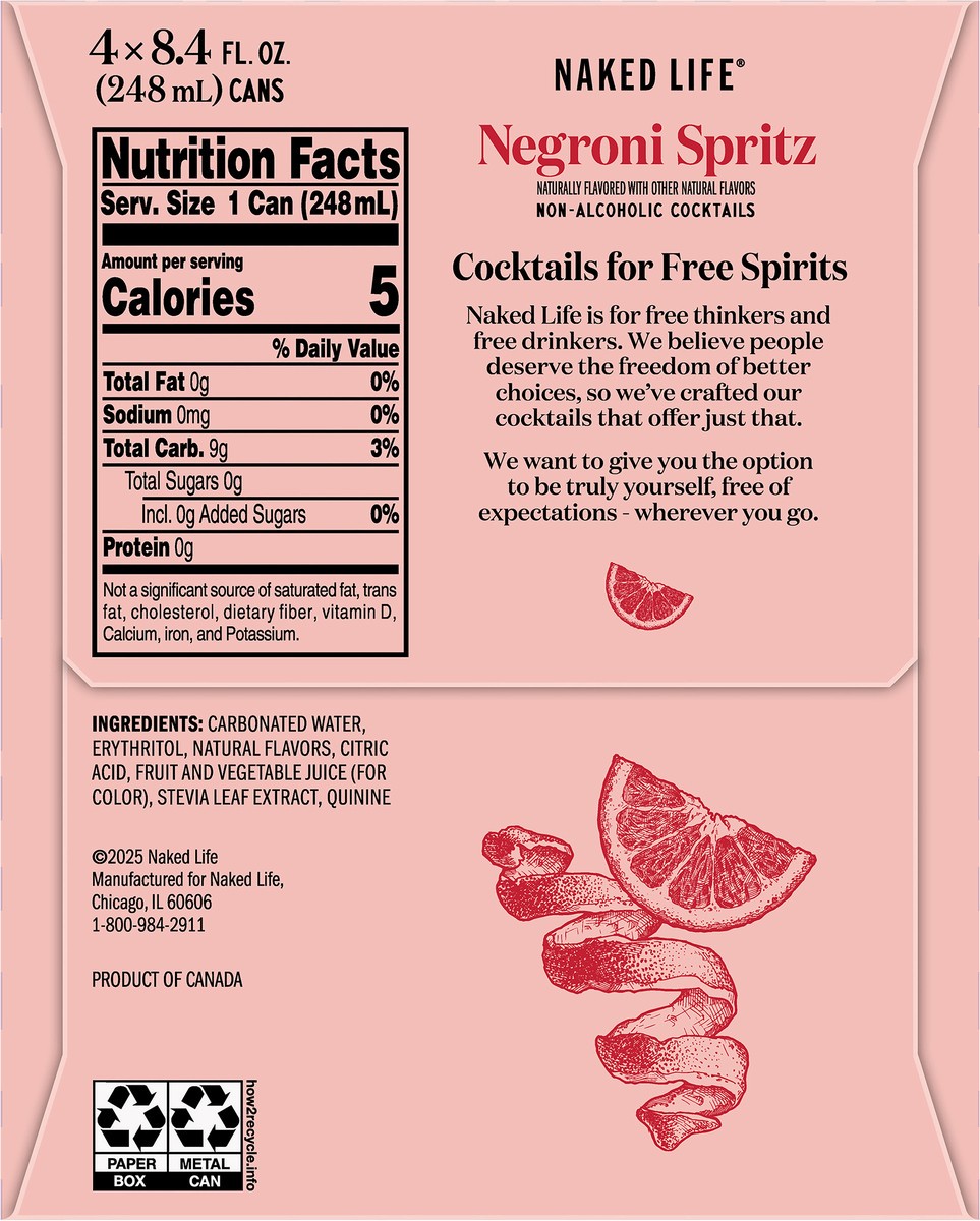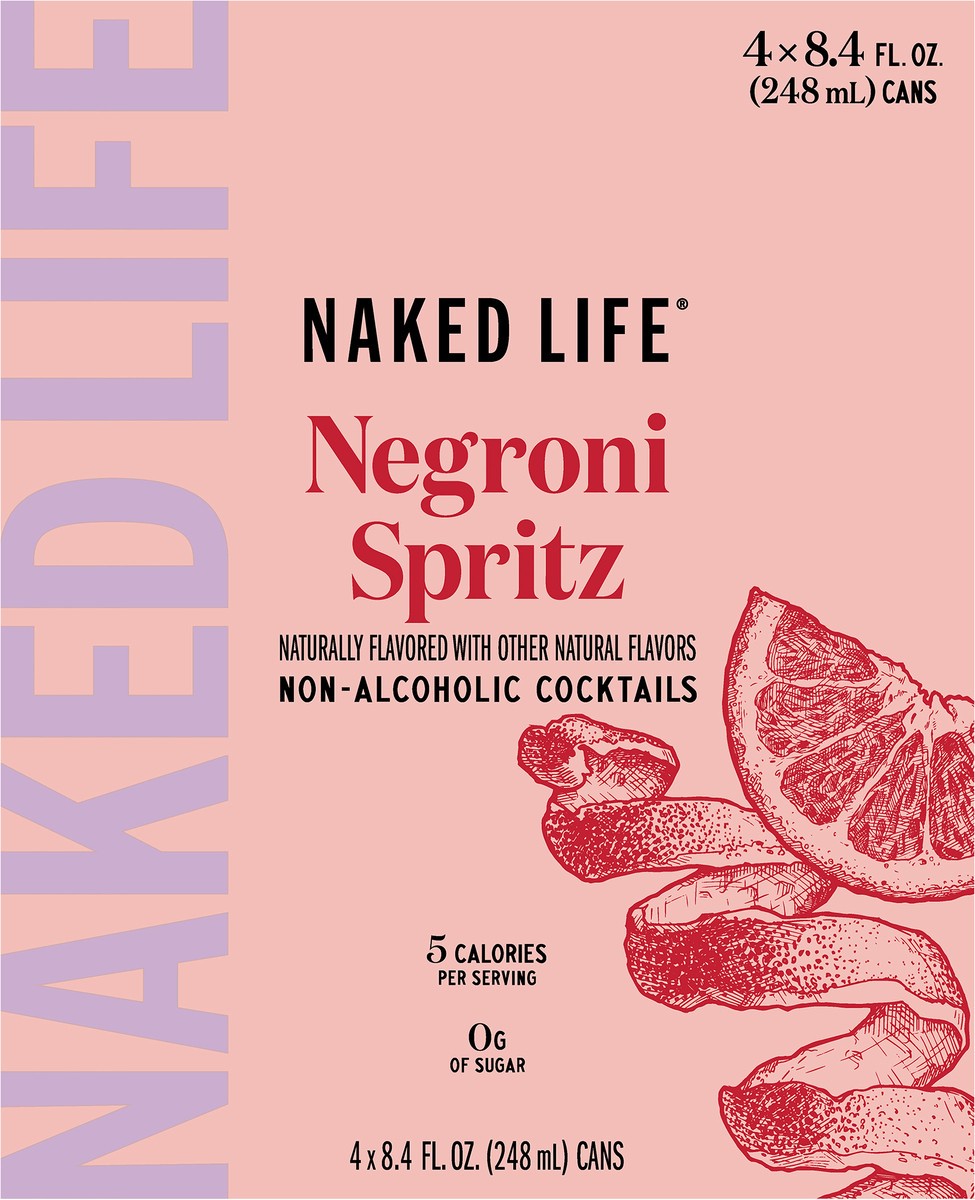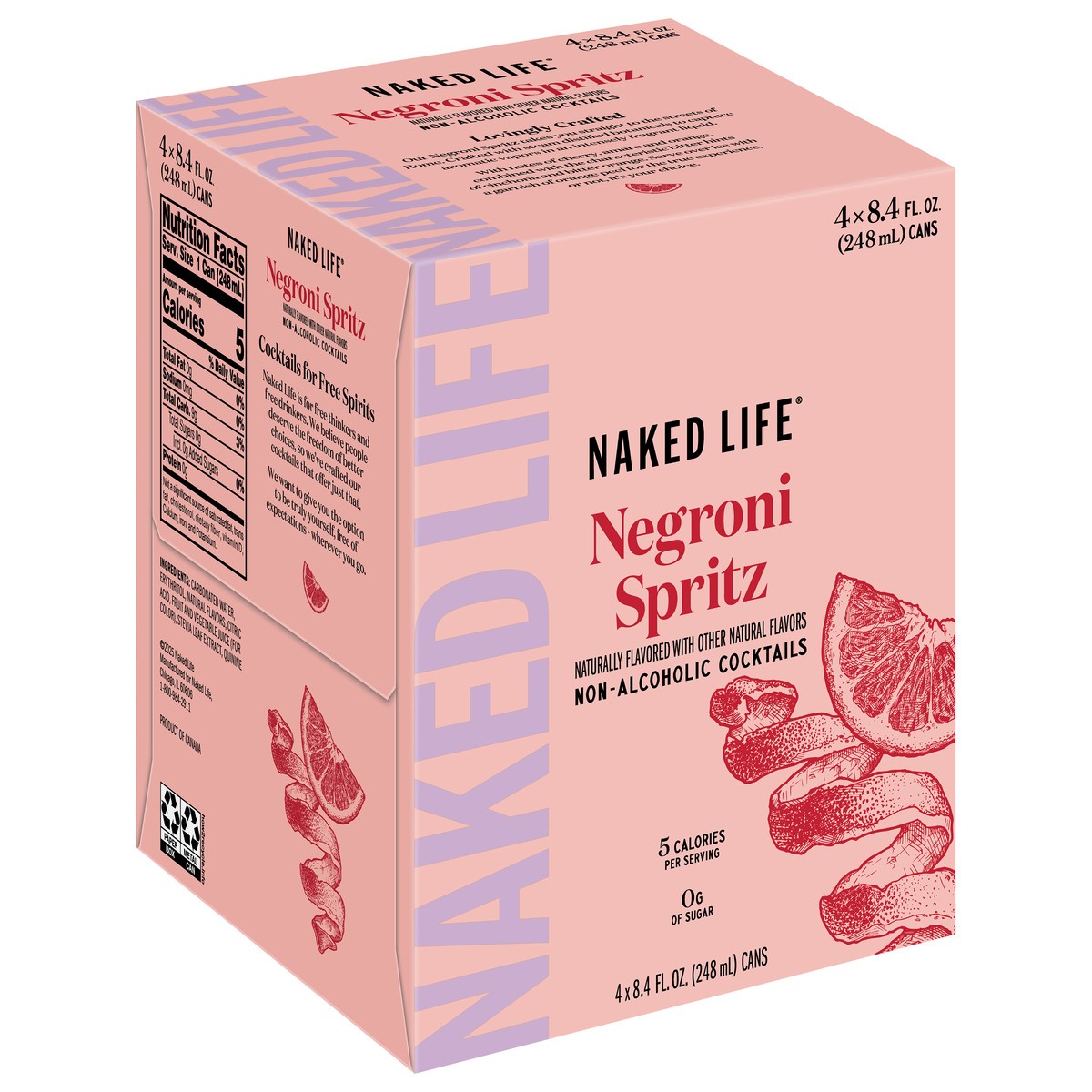 - 4 pack 8.4 fl oz cans of Naked Life Negroni Spritz Non-Alcoholic CocktailNon-alcoholic Negroni Spritz combines notes of cherry