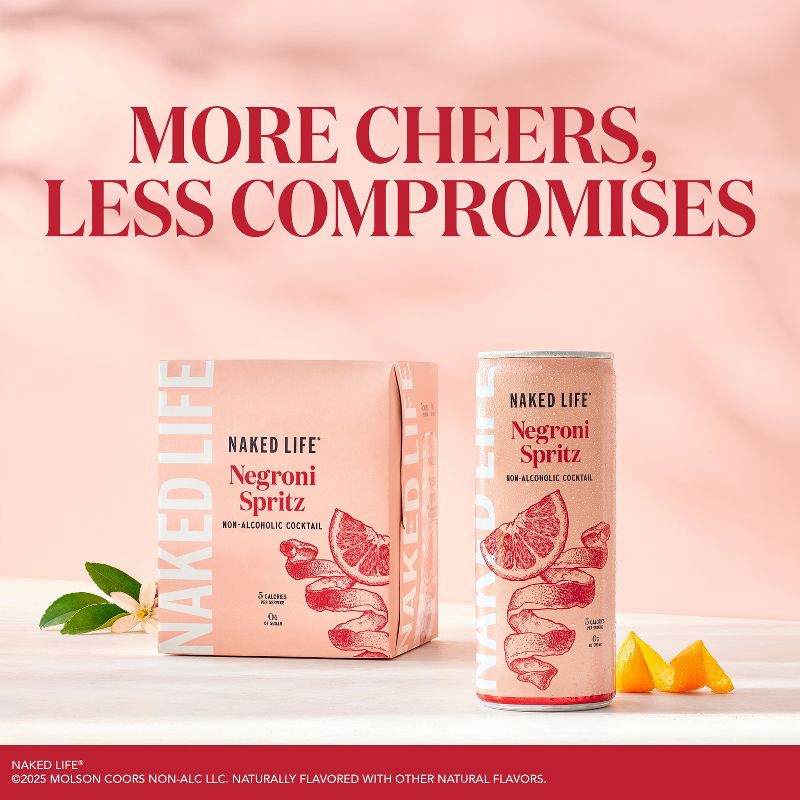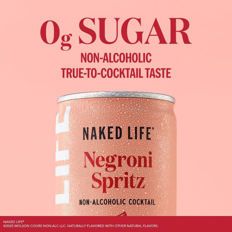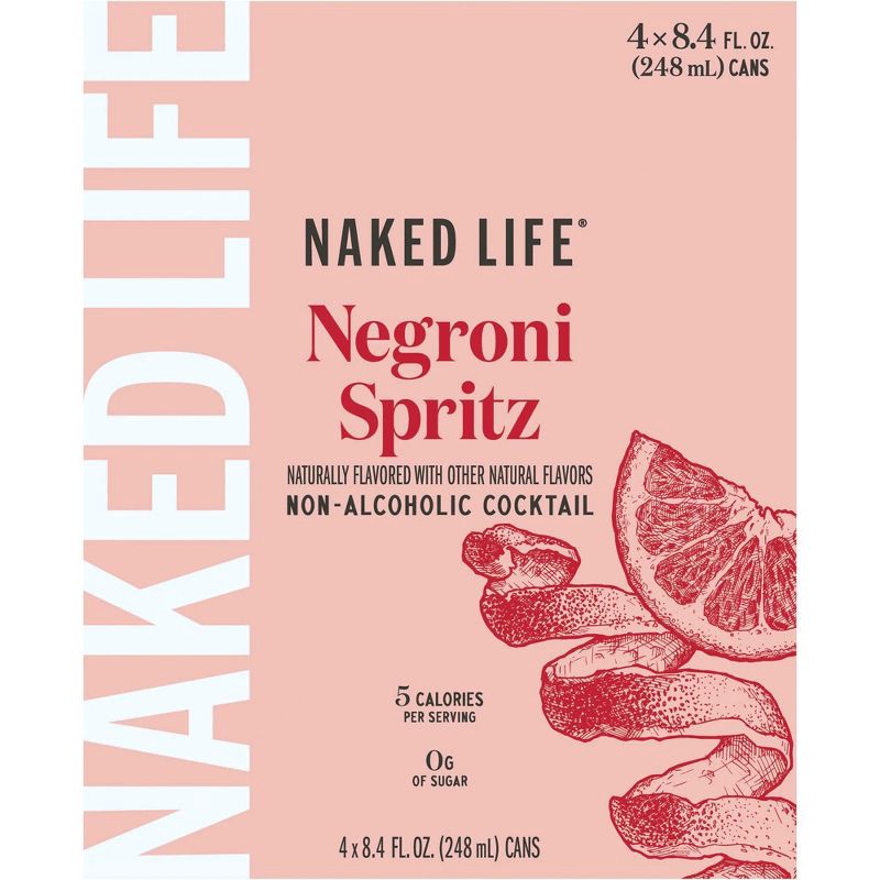- 4 pack 8.4 fl oz cans of Naked Life Negroni Spritz Non-Alcoholic Cocktail