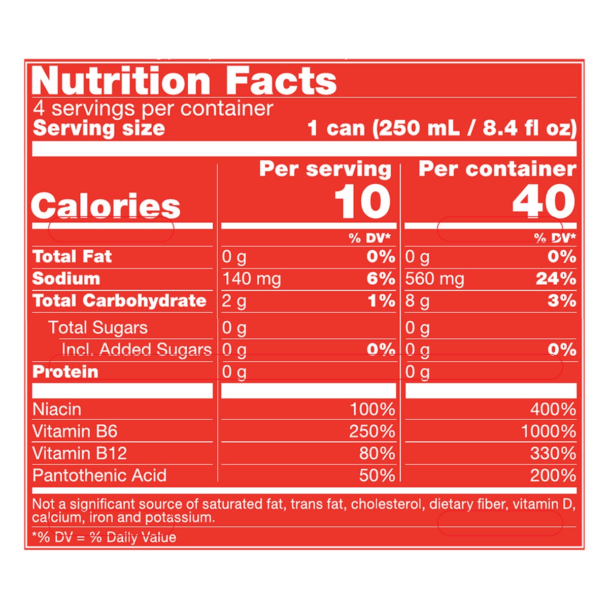 Carbonated Water, Citric Acid, Taurine, Sodium Citrate, Caffeine, Colors, Sucralose, Acesulfame K, Xanthan Gum, Natural and Artificial Flavors, Niacinamide, Pyridoxine HCl (Vitamin B6), Calcium Pantot…