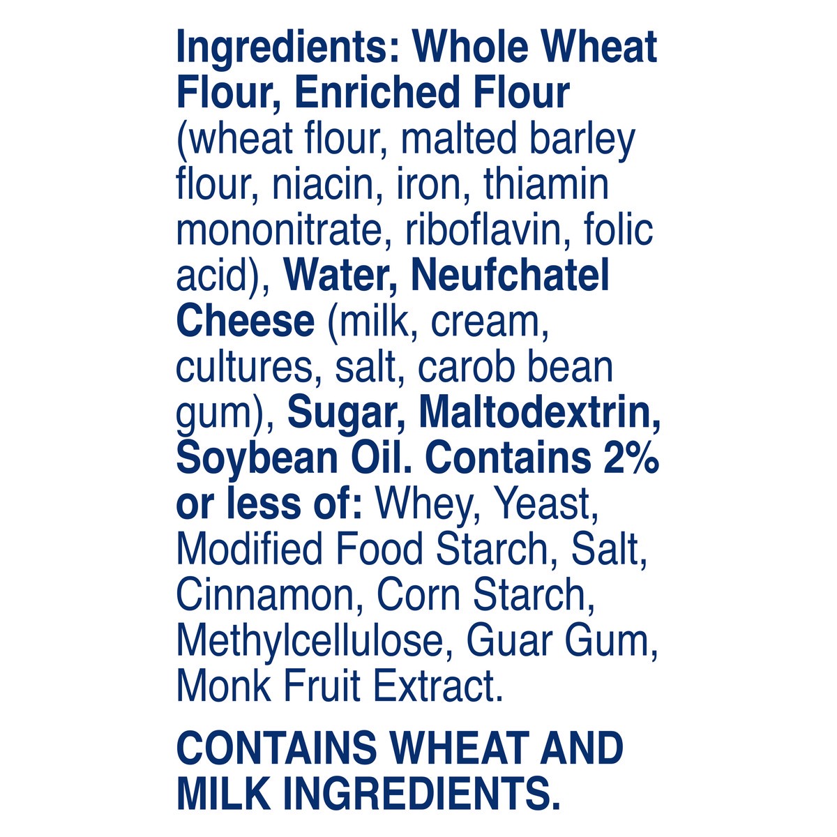 Whole Wheat Flour, Enriched Flour (Wheat Flour, Malted Barley Flour, Niacin, Iron, Thiamin Mononitrate, Riboflavin, Folic Acid), Water, Neufchatel Cheese (Milk, Cream, Cultures, Salt, Carob Bean Gum),…