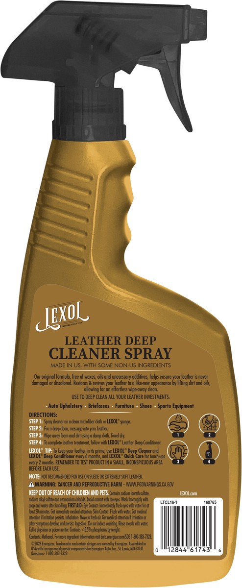 Bring leather back to life with Lexol All Leather Deep Cleaner Spray. Sunlight, heat, humidity and dirt age and wear the leather you love. This spray cleaner gently loosens and lifts dirt, easily wipi…