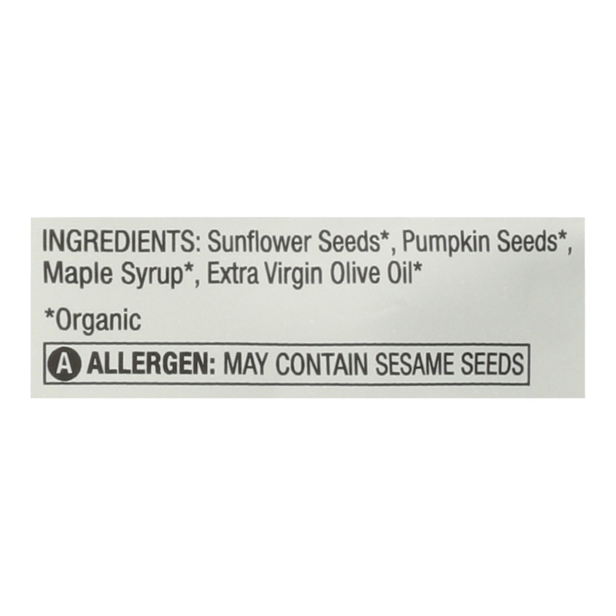 Sunflower Seeds (Organic), Pumpkin Seeds (Organic), Maple Syrup (Organic), Extra Virgin Olive Oil (Organic).