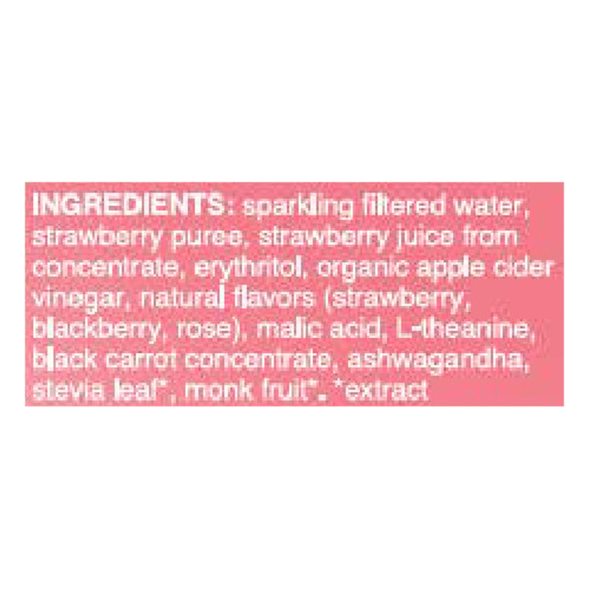 Sparkling Filtered Water, Strawberry Puree, Strawberry Juice from Concentrate, Erythritol, Organic Apple Cider Vinegar, Natural Flavors (Strawberry, Blackberry, Rose), Malic Acid, L-Theanine, Black Ca…