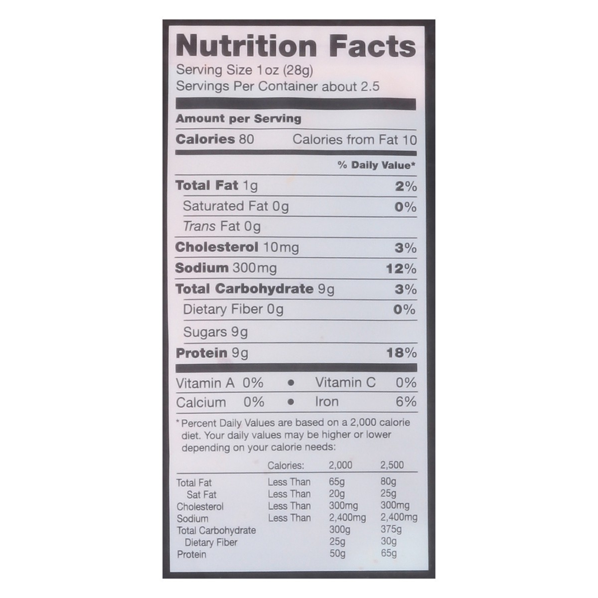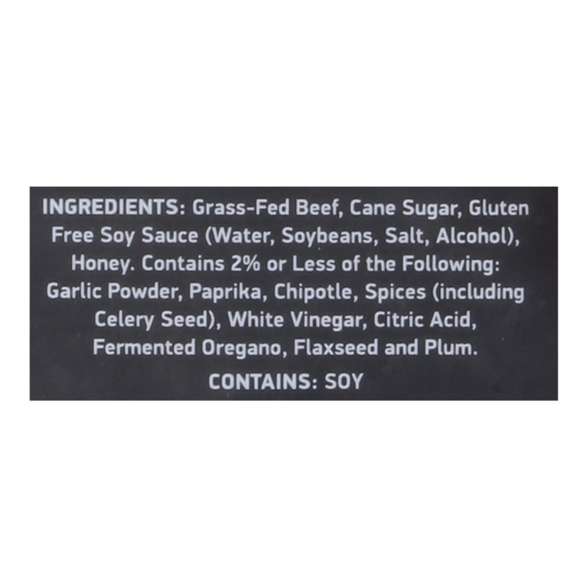 Grass-Fed Beef, Cane Sugar, Gluten Free Soy Sauce (Water, Soybeans, Salt, Alcohol), Honey, Contains 2% or Less of the Following: Garlic Powder, Paprika, Chipotle, Spices (Including Celery Seed), White…