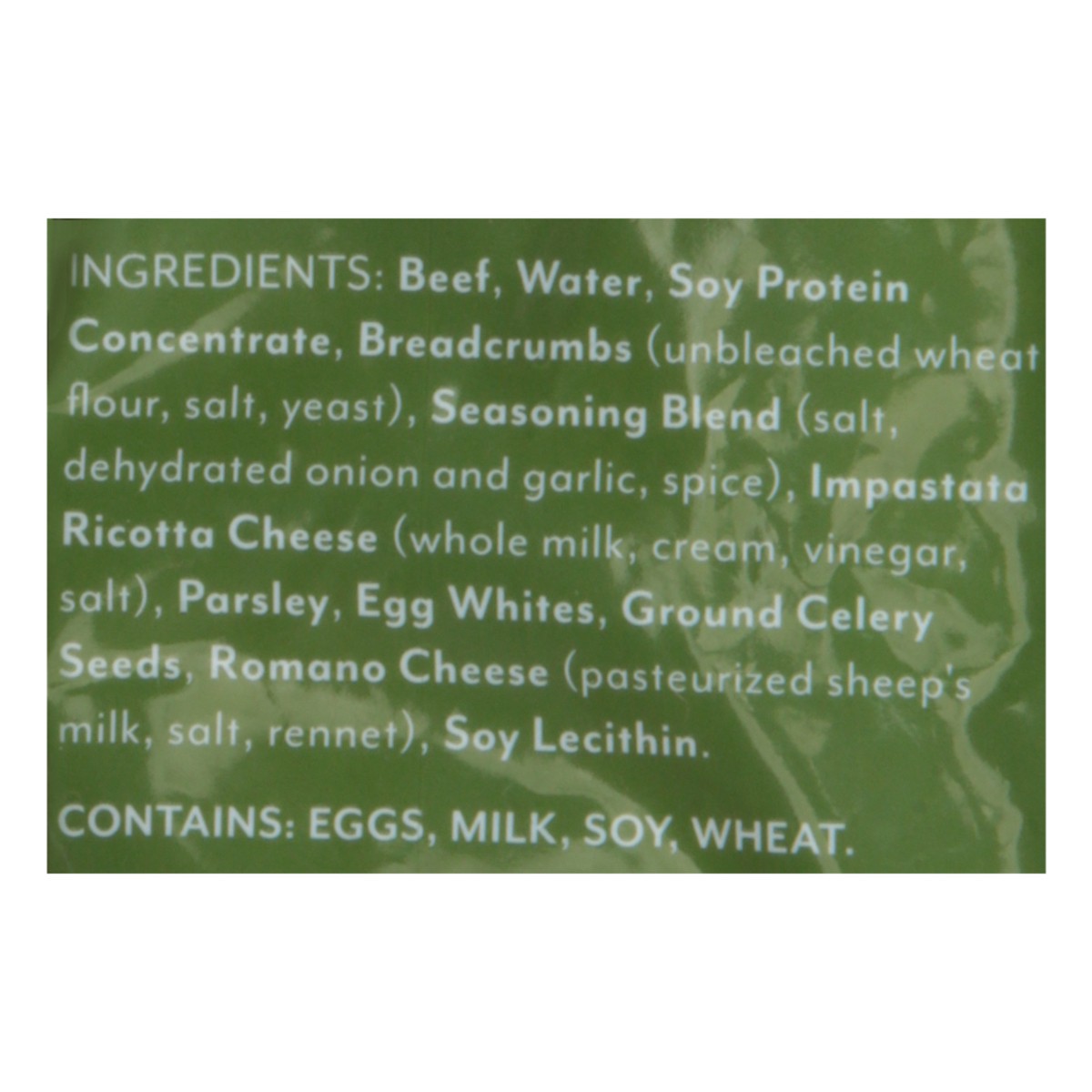 Beef, Water, Soy Protein Concentrate, Breadcrumbs (Unbleached Wheat Flour, Salt, Yeast), Seasoning Blend (Salt, Dehydrated Onion and Garlic, Spice), Impastata Ricotta Cheese (Whole Milk, Cream, Vinega…