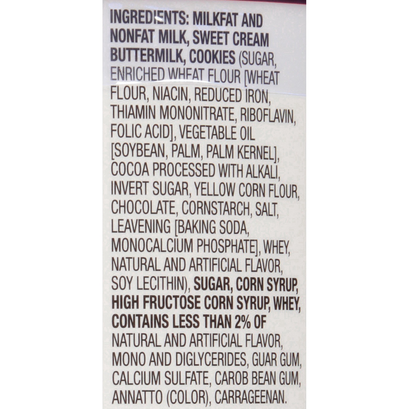 Milkfat and Nonfat Milk, Sweet Cream Buttermilk, Liquid Sugar (Sugar, Water), Cookies (Sugar, Enriched Wheat Flour [Wheat Flour, Niacin, Reduced Iron, Thiamin Mononitrate, Riboflavin, Folic Acid], Veg…