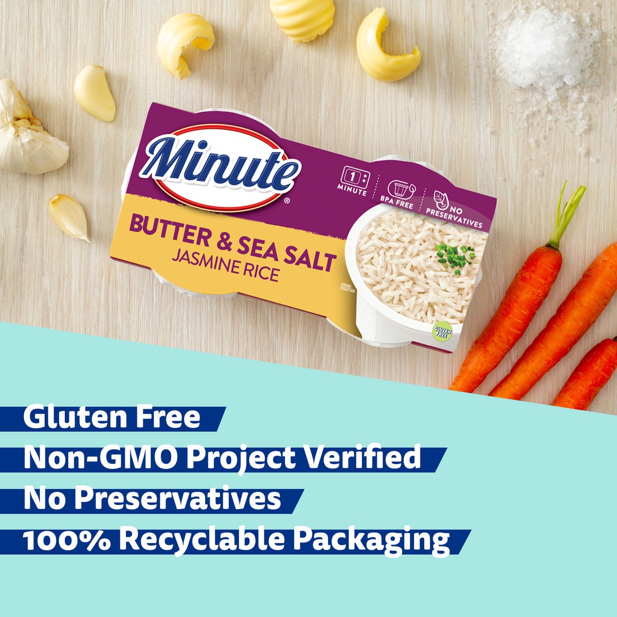 Minute Butter & Sea Salt Rice is a convenient, ready to heat long grain flavored rice to complete any meal. Each 8.8 oz. pack includes 4 perfectly portioned BPA-Free cups with light and fluffy butter …