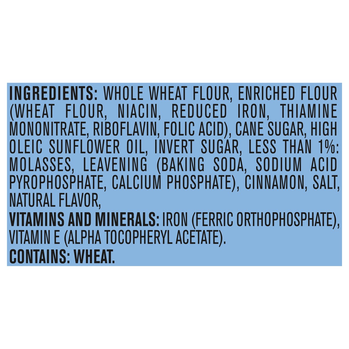 Whole Wheat Flour, Enriched Flour (Wheat Flour, Niacin, Reduced Iron, Thiamine Mononitrate, Riboflavin, Folic Acid), Cane Sugar, High Oleic Sunflower Oil, Invert Sugar, Less than 1%: Molasses, Leaveni…