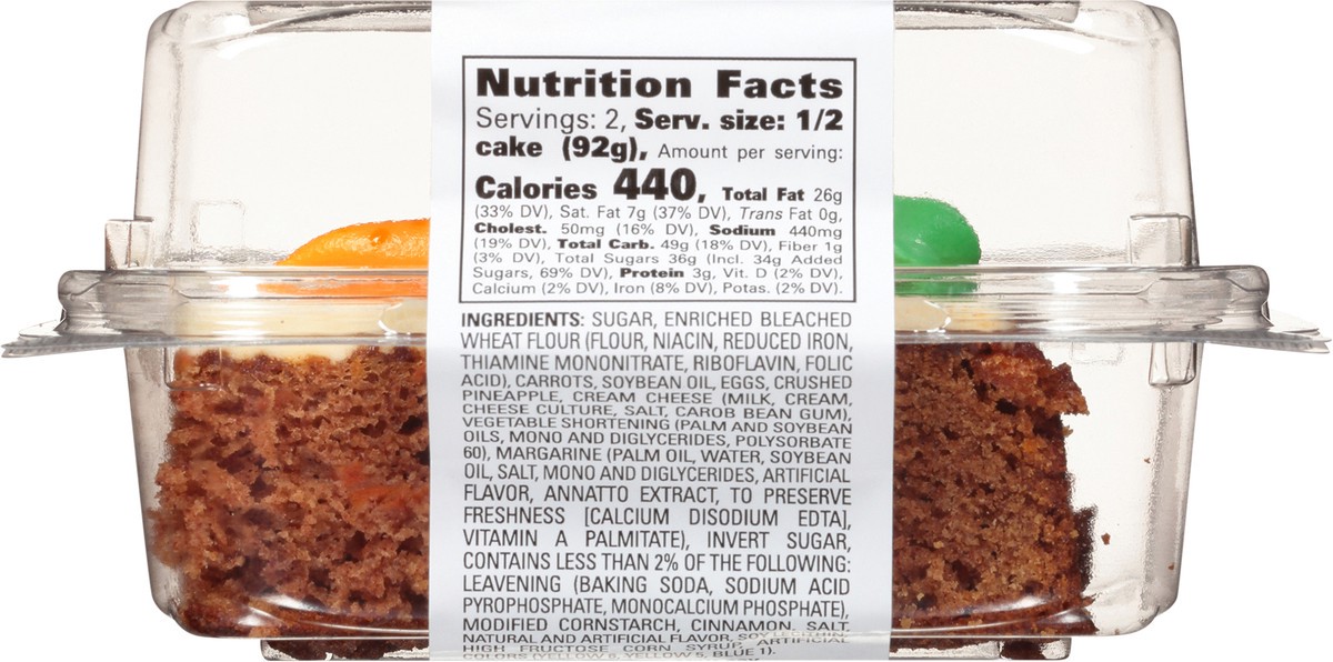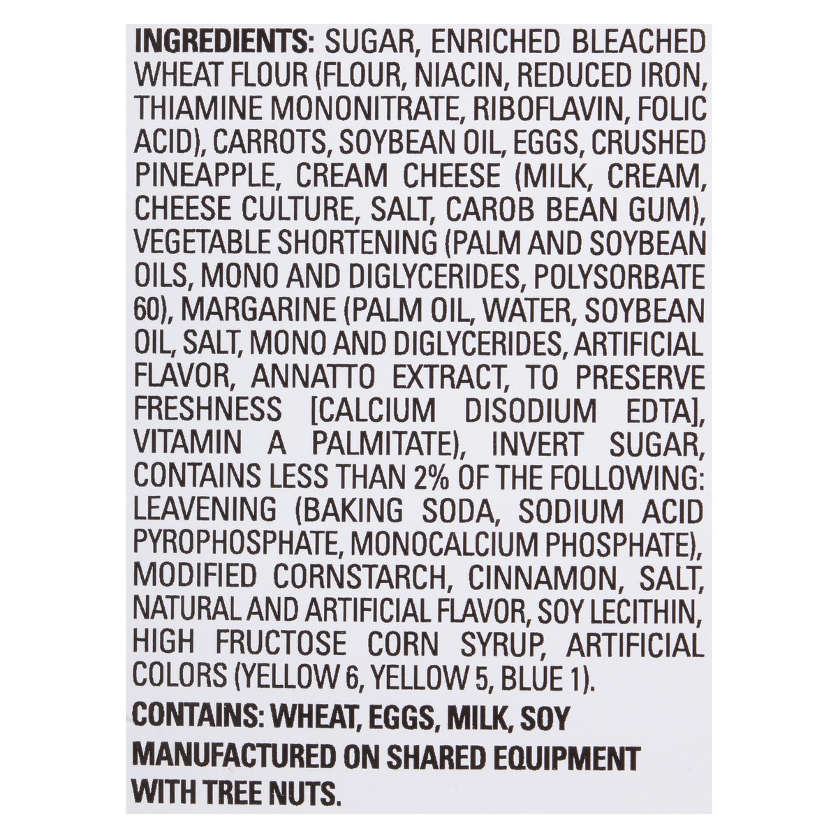 SUGAR, ENRICHED BLEACHED WHEAT FLOUR (FLOUR, NIACIN, REDUCED IRON, THIAMINE MONONITRATE, RIBOFLAVIN, FOLIC ACID), CARROTS, SOYBEAN OIL, EGGS, CRUSHED PINEAPPLE, CREAM CHEESE (MILK, CREAM, SALT, CAROB …
