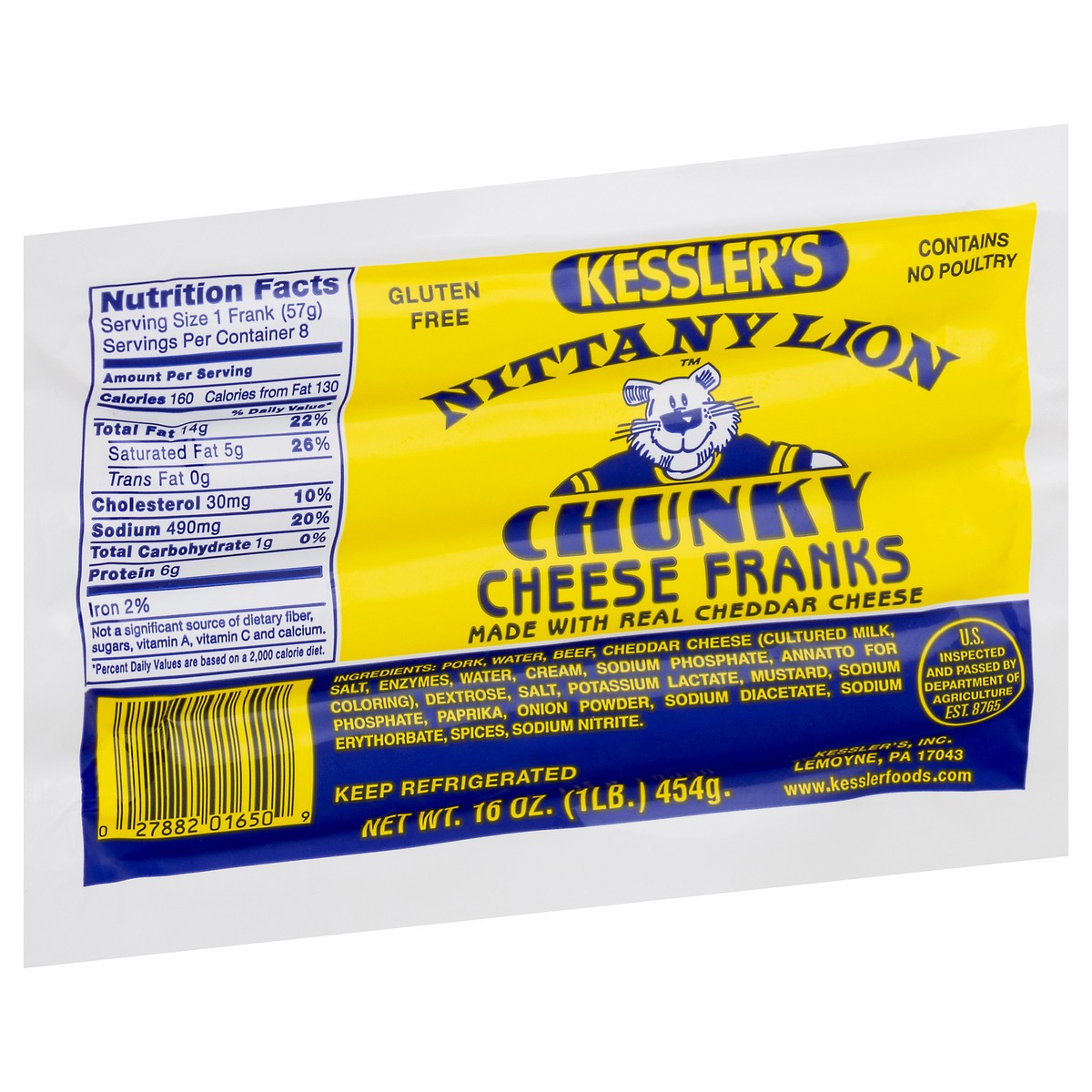Made with real cheddar cheese. Gluten free. Contains No poultry. U.S. Inspected and passed by Department of Agriculture. www.kesslerfoods.com.
