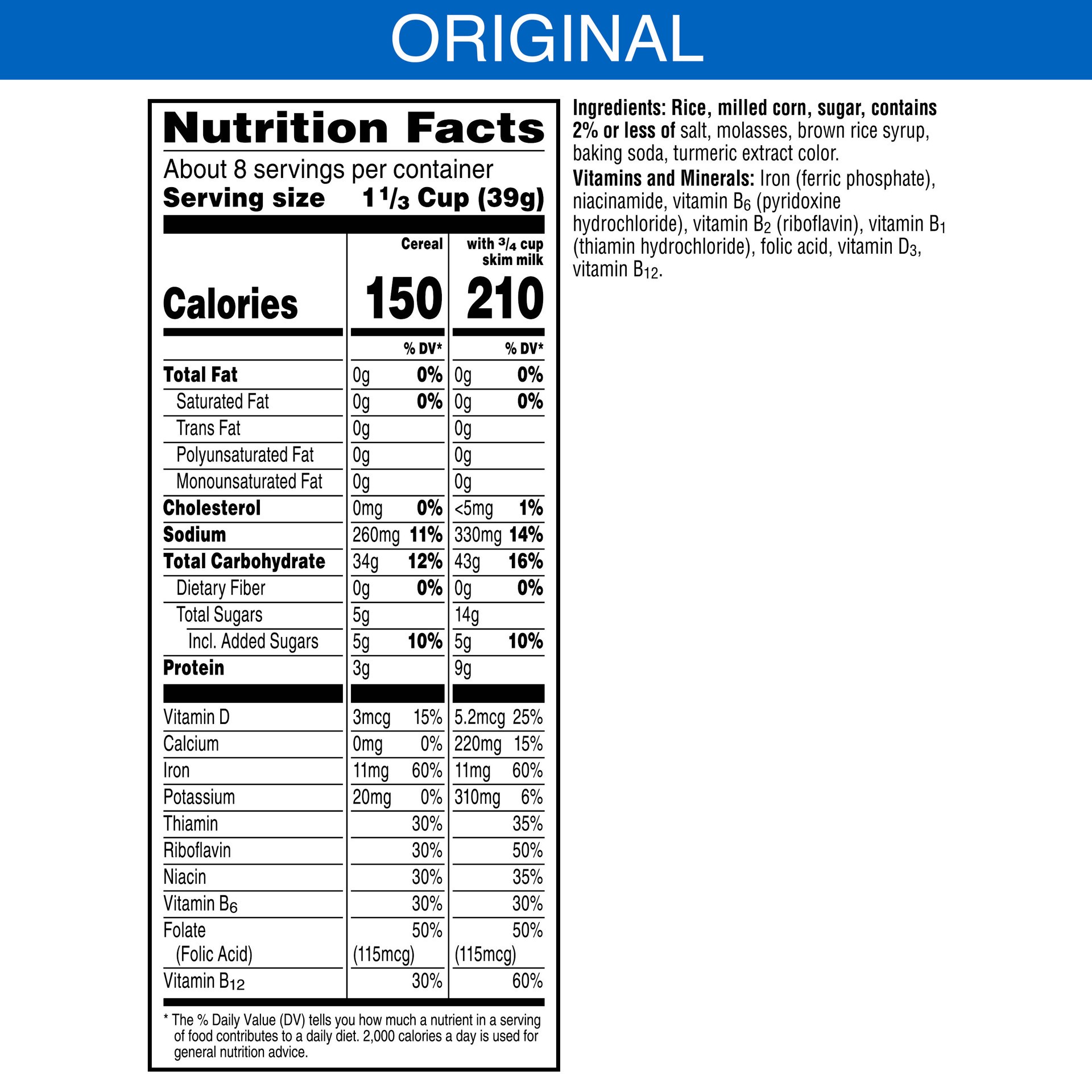Rice, Milled Corn, Sugar, Contains 2% or Less of Salt, Molasses, Brown Rice Syrup, Baking Soda, Turmeric Extract Color, Vitamins and Minerals: Iron (Ferric Phosphate), Niacinamide, Vitamin B6 (Pyridox…