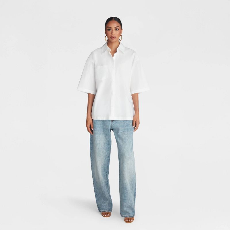 A menswear-inspired staple, this poplin shirt is designed for an oversized boxy fit and features elbow-length sleeves. Complete with a slightly high-low hem, patch chest pocket, and button-down front.…