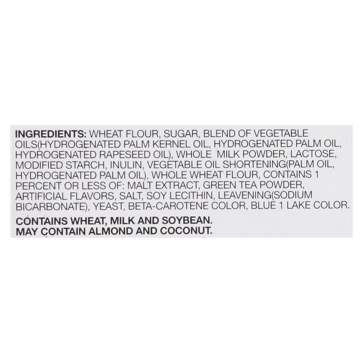 Wheat Flour, Sugar, Blend of Vegetable Oils(Hydrogenated Palm Kernel Oil, Hydrogenated Palm Oil, Hydrogenated Rapeseed Oil), Whole Milk Powder, Lactose, Modified Starch, Inulin, Vegetable Oil Shorteni…