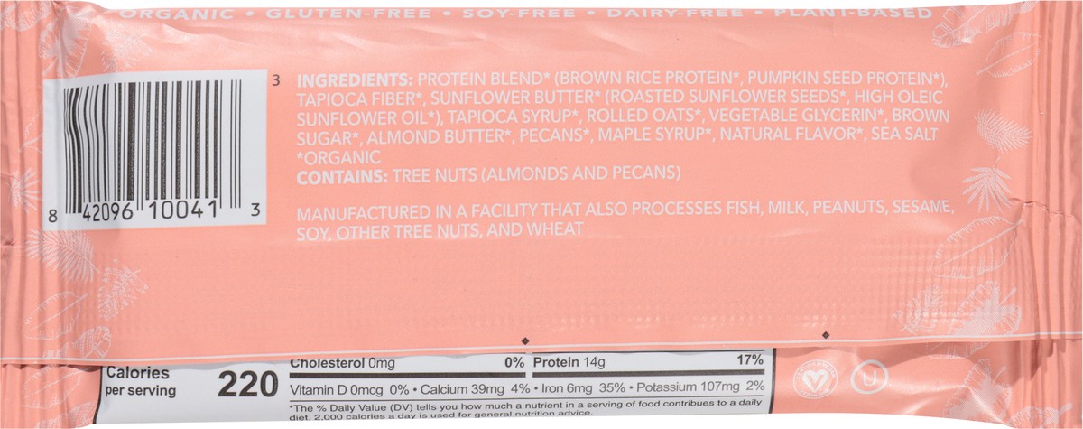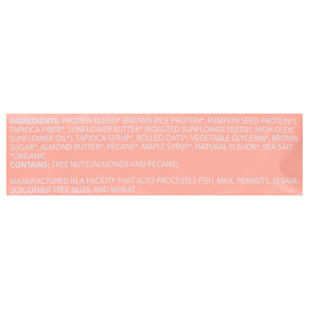 Protein Blend (Organic) (Brown Rice Protein (Organic), Pumpkin Seed Protein (Organic)), Tapioca Syrup (Organic), Sunflower Seed Butter (Organic), (Roasted Sunflower Seeds (Organic), Sunflower Oil (Org…