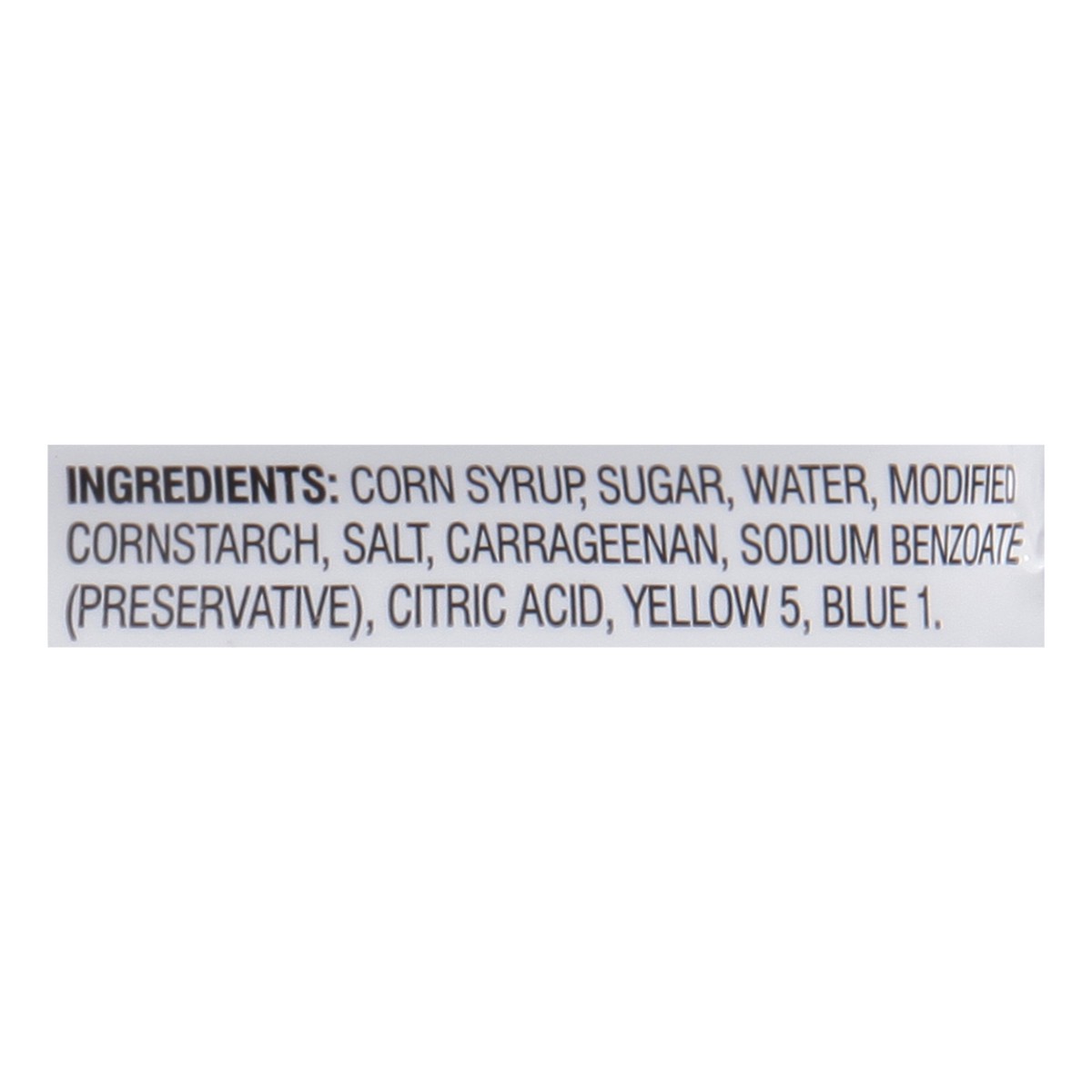 Corn Syrup\, Sugar\, Water\, Modified Cornstarch\, Salt\, Carrageenan\, Sodium Benzoate (Preservative)\, Citric Acid\, Yellow 5\, Blue 1.