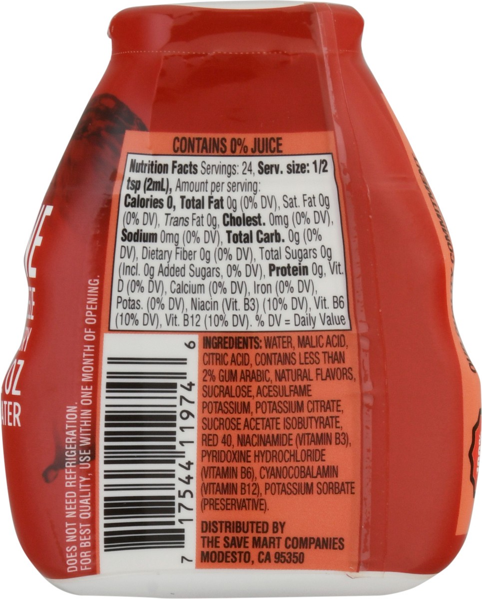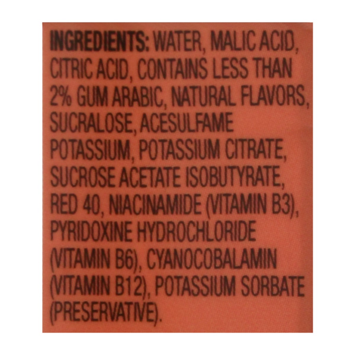 Water, Malic Acid, Citric Acid, Contains Less than 2% Gum Arabic, Natural Flavors, Sucralose, Acesulfame Potassium, Potassium Citrate, Sucrose Acetate Isobutyrate, Red 40, Niacinamide (Vitamin B3) Pyr…