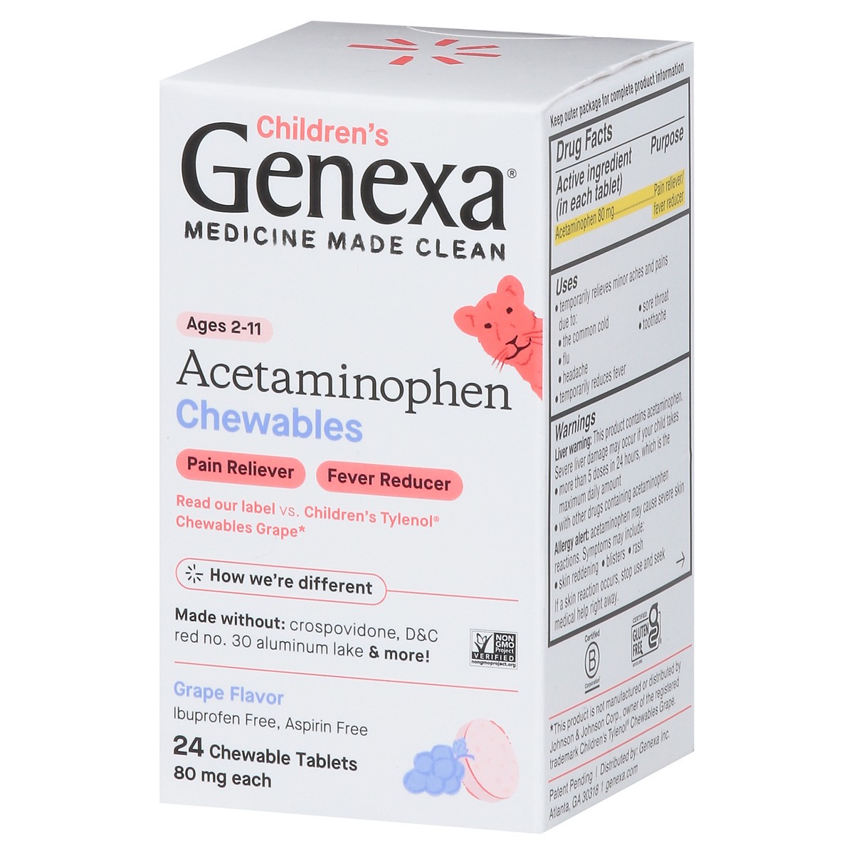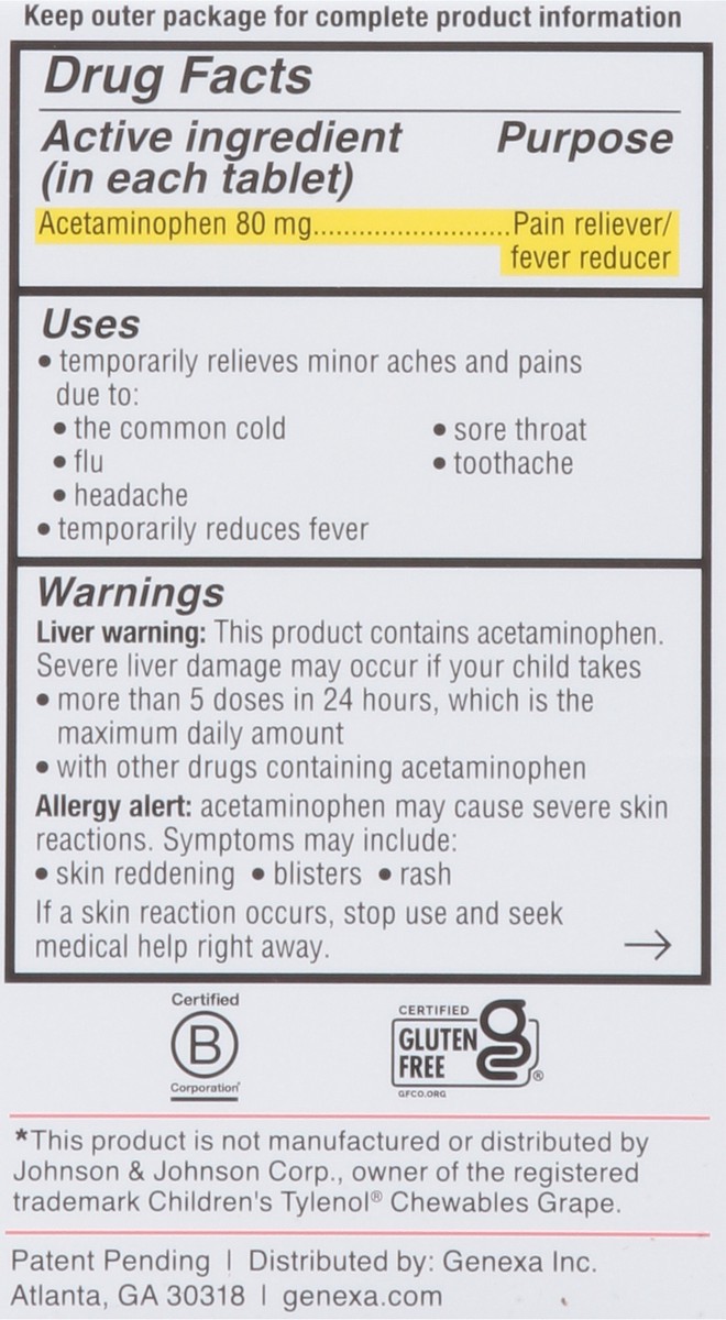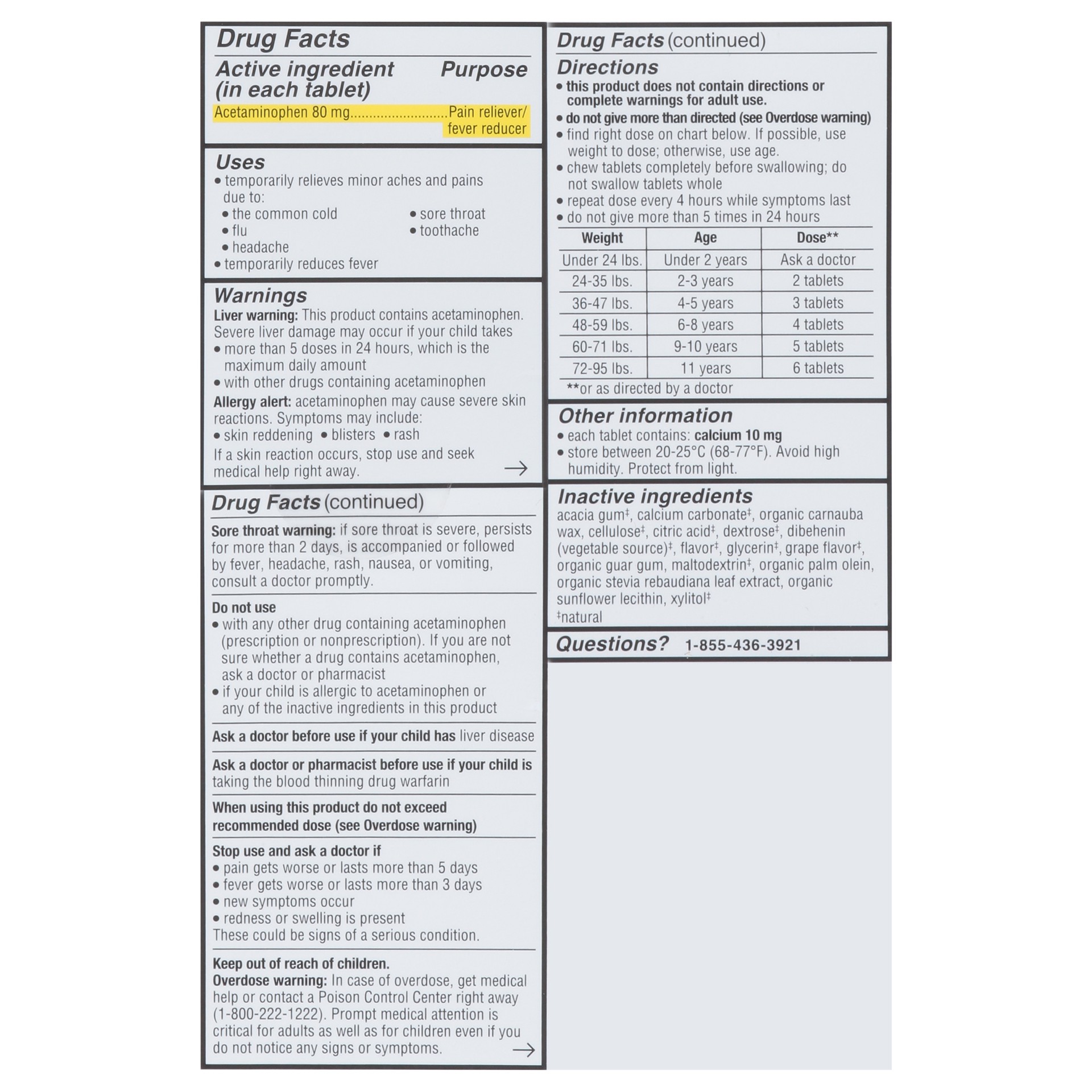 Active Ingredients: Acetaminophen (80 mg), Pain Reliever/Fever Reducer. Inactive Ingredients: Acacia Gum (Natural), Calcium Carbonate (Natural), Organic Carnauba Wax, Cellulose (Natural), Citric Acid …