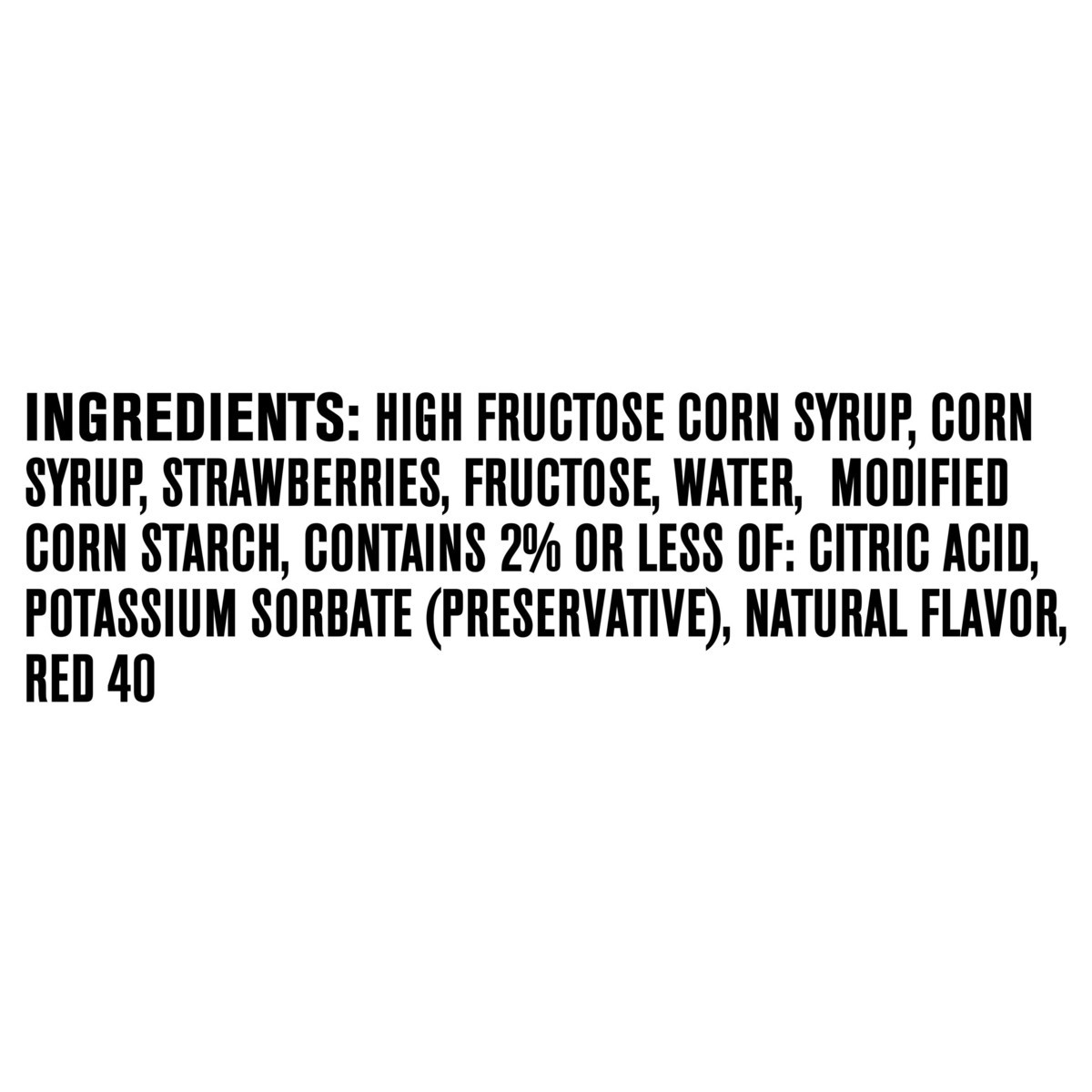 High Fructose Corn Syrup, Corn Syrup, Strawberries, Fructose, Water, Modified Corn Starch, Contains 2% or Less of: Citric Acid, Potassium Sorbate (Preservative), Natural Flavor, Red 40.