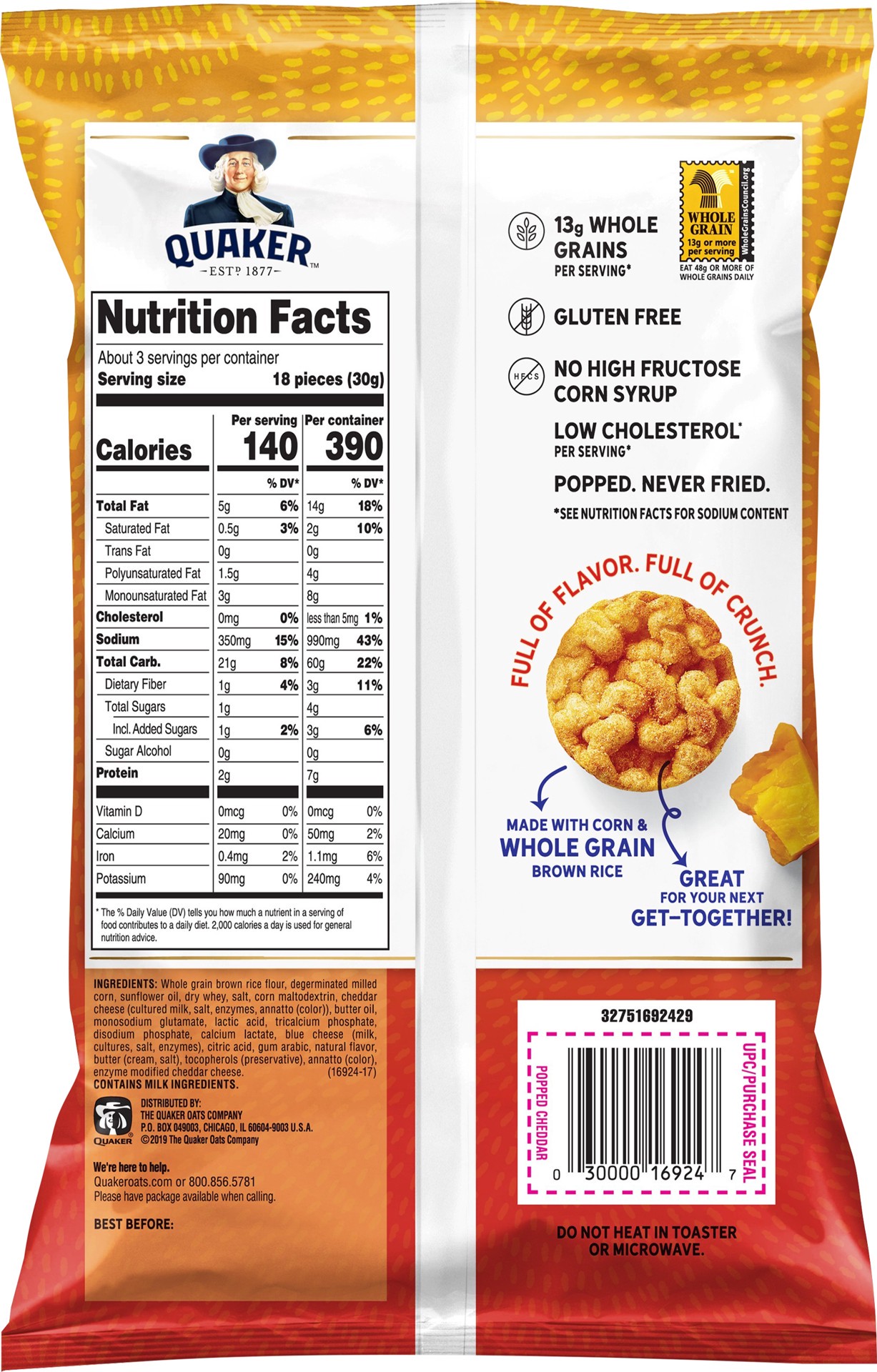 Whole Grain Brow Rice Flour, Corn Grits, Vegetable Oil (Canola and/or Sunflower Oil), Corn Maltodextrin, Whey, Salt, Cheddar Cheese (Cultured Milk, Salt, Enzymes), Butter Oil, Gum Arabic, Annatto Extr…