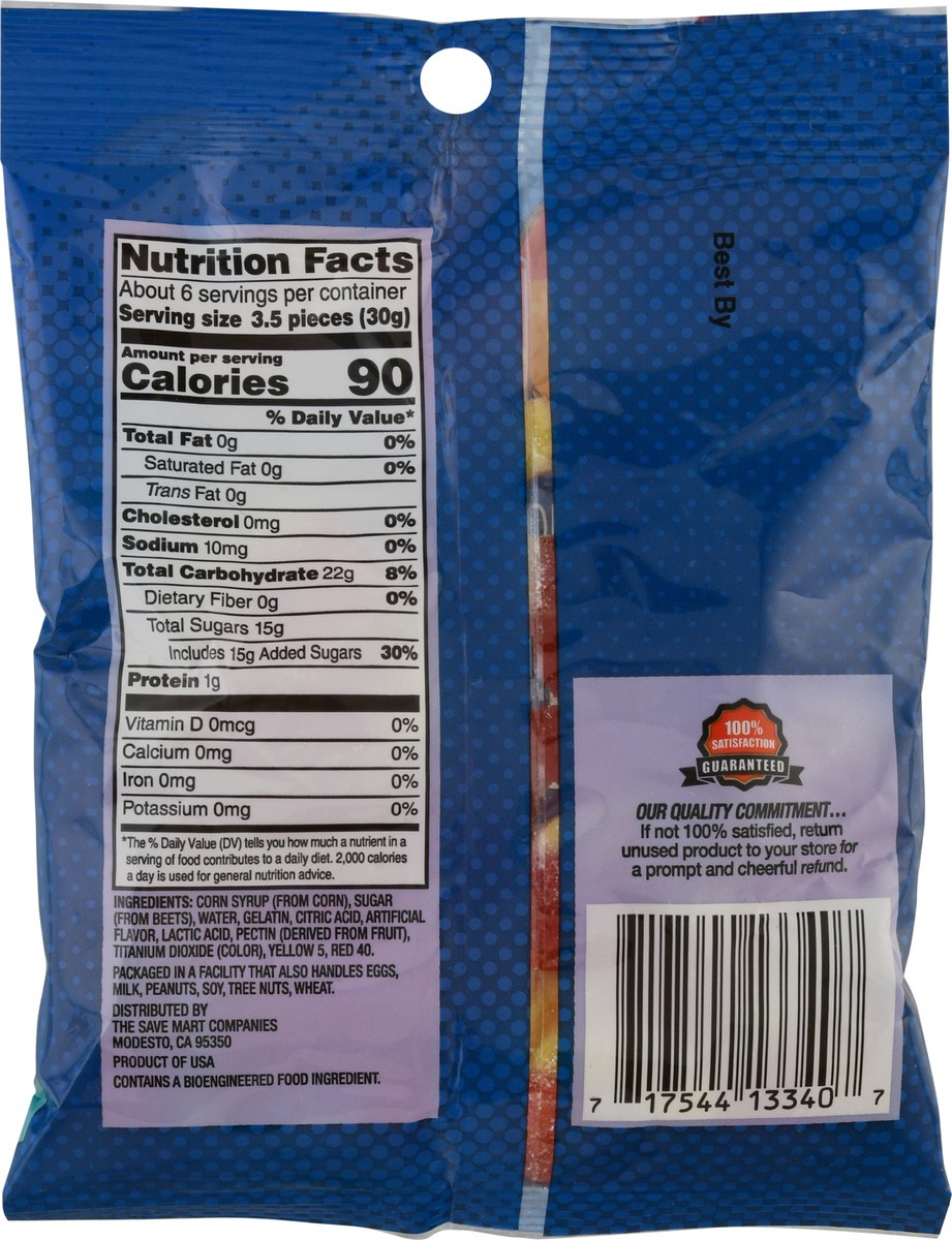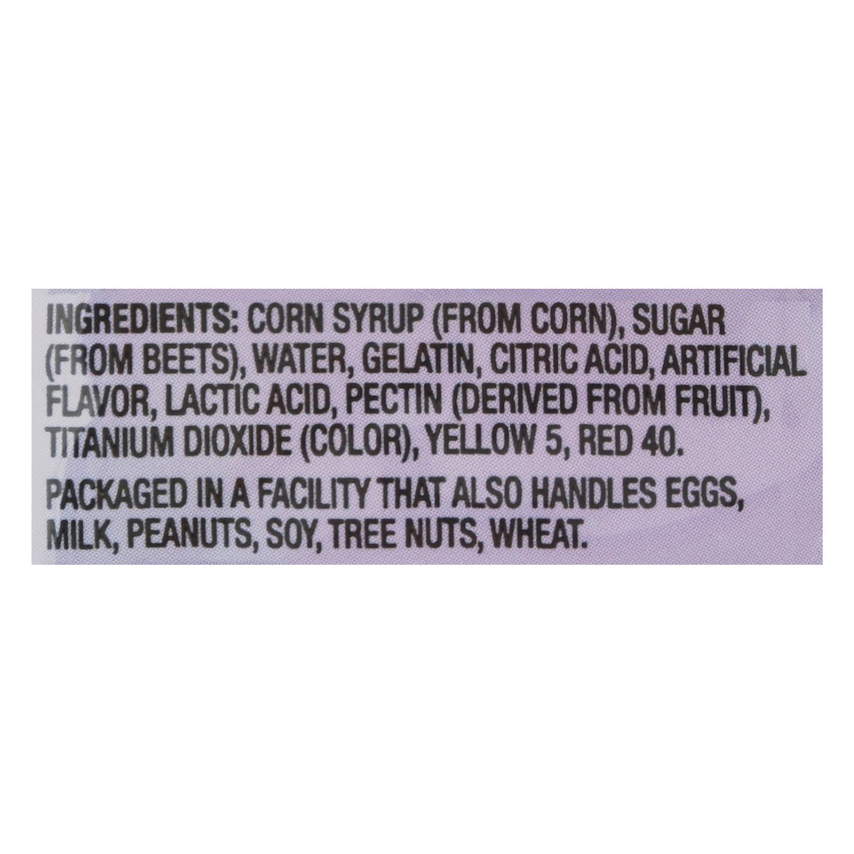 Corn Syrup (from Corn), Sugar (from Beets), Water, Gelatin, Citric Acid, Artificial Flavor, Lactic Acid, Pectin (Derived from Fruit), Titanium Dioxide (Color), Yellow 5, Red 40.