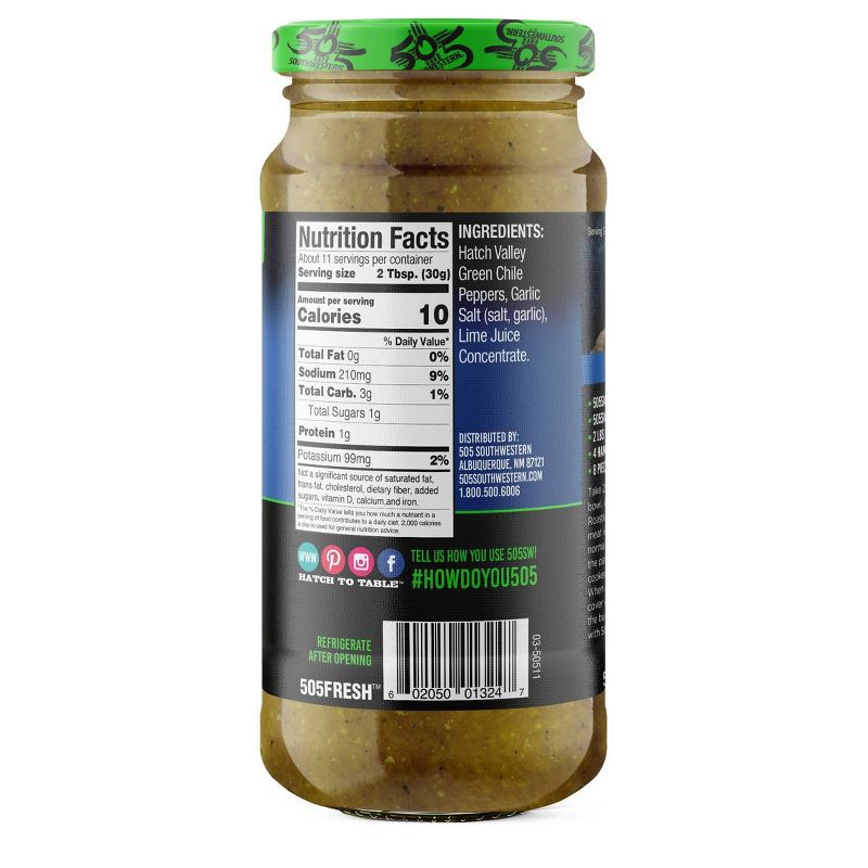 Hatch Valley Green Chile Peppers, Garlic Salt (Salt, Garlic), Lime Juice Concentrate.