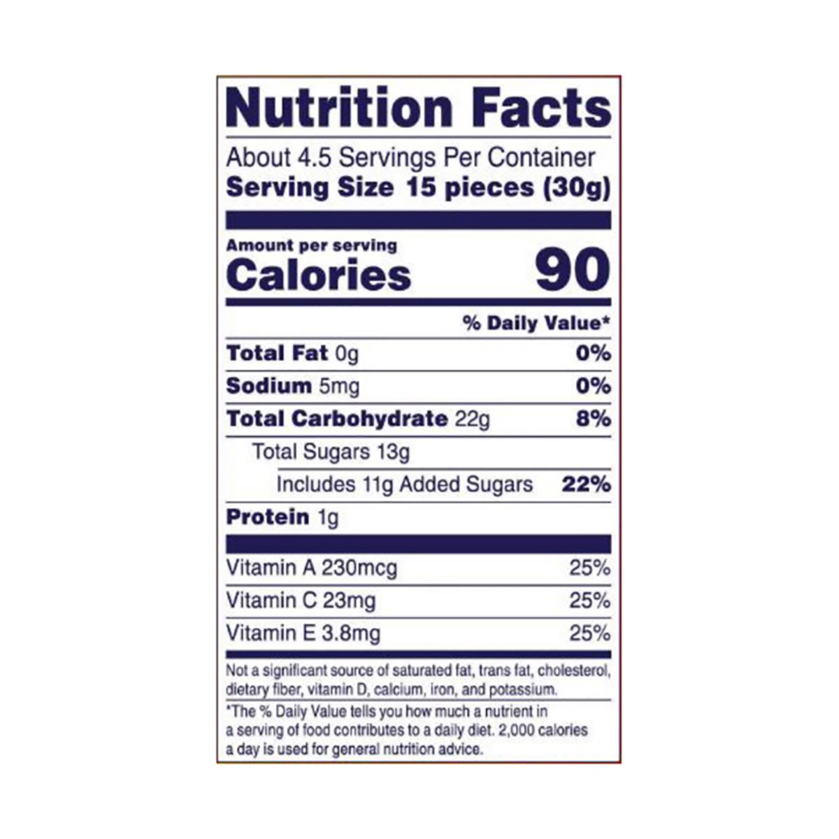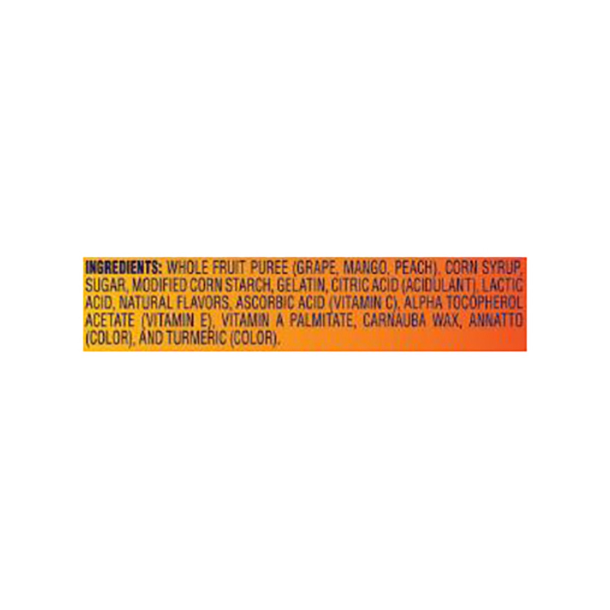 Whole Fruit Puree (Grape, Mango, Peach), Corn Syrup, Sugar, Modified Corn Starch, Gelatin, Citric Acid (Acidulant), Lactic Acid, Natural Flavors, Ascorbic Acid (Vitamin C), Alpha Tocopherol Acetate (V…