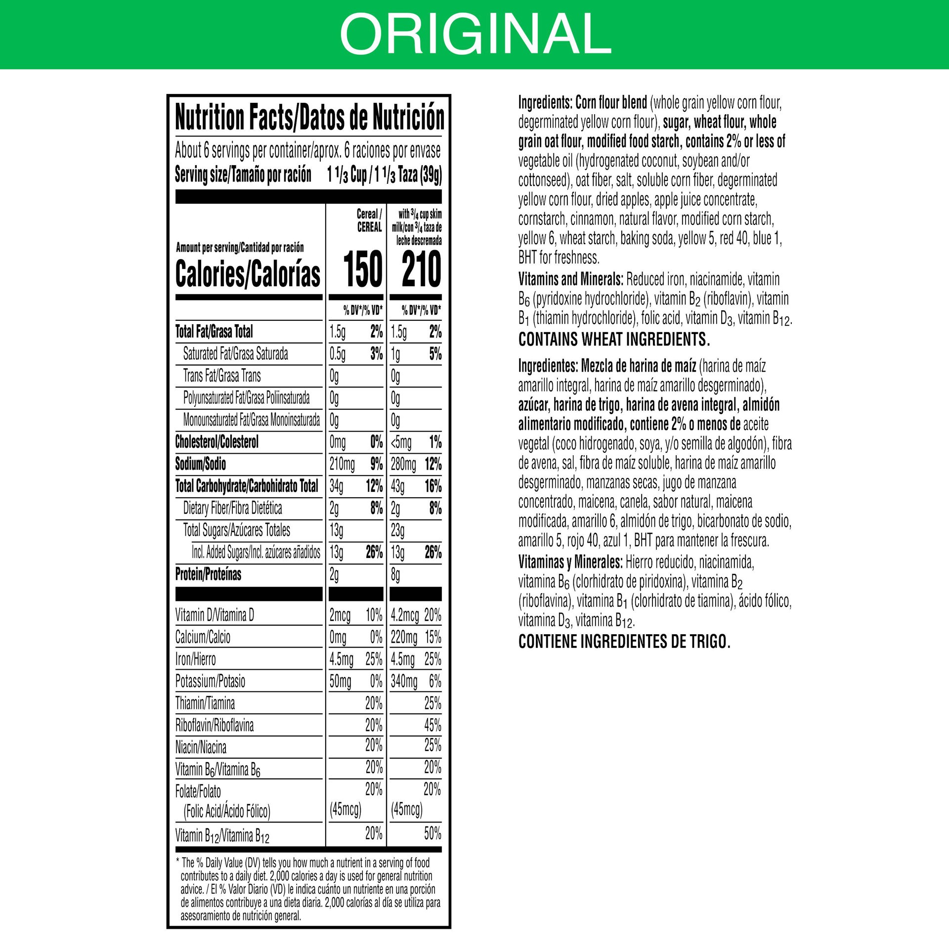 Corn Flour Blend (Whole Grain Yellow Corn Flour, Degerminated Yellow Corn Flour), Sugar, Wheat Flour, Whole Grain Oat Flour, Modified Food Starch, Contains 2% or Less of Vegetable Oil (Hydrogenated Co…