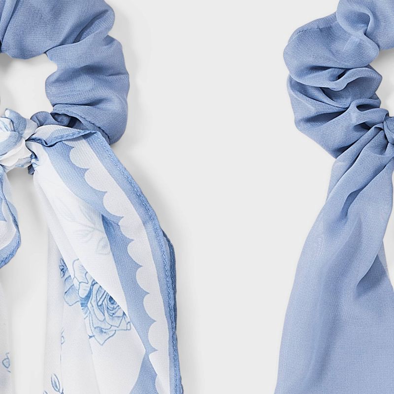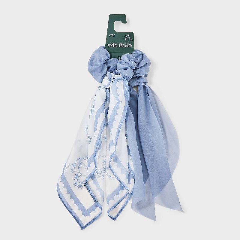Two-count twister with tails set from Wild Fable™. Includes two blue ponytail holders with flowing scarf-like ends, with one showcasing a printed design on its tails. Perfect for securing and styling …