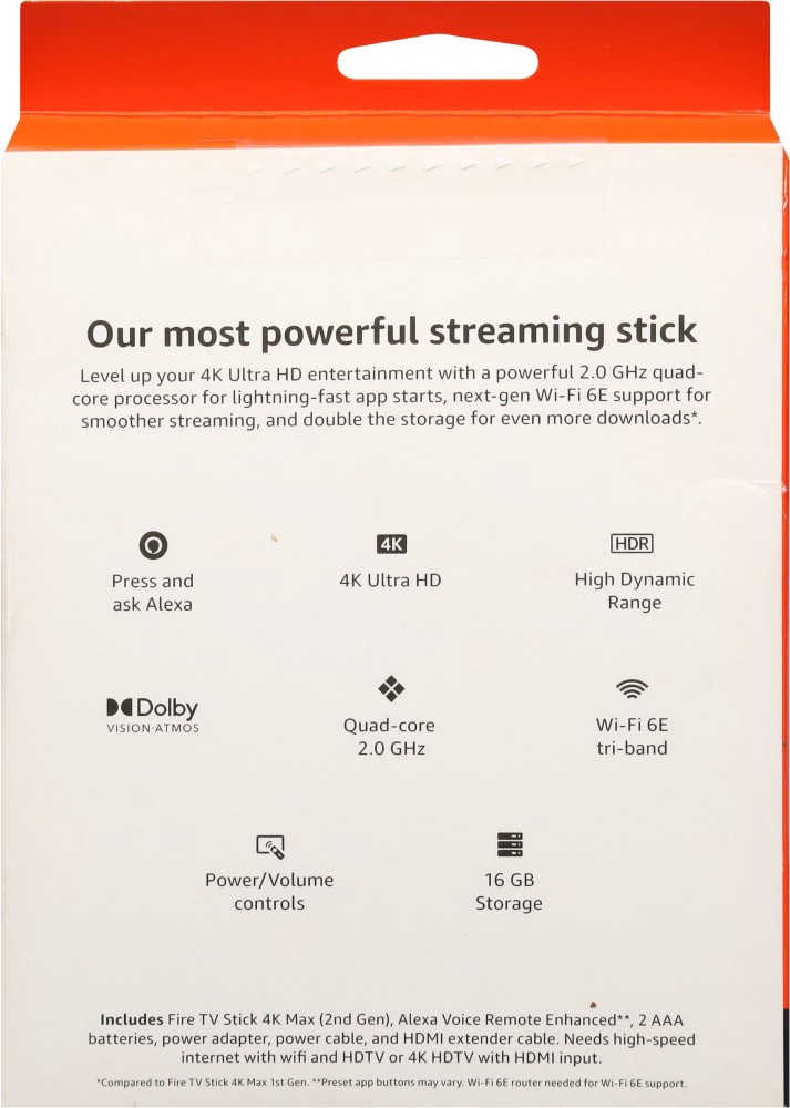 Our most powerful 4K streaming stick. Level up your 4K Ultra HD entertainment with a powerful 2.0 GHz quad-core processor for lightning-fast app starts, next-gen Wi-Fi 6E support for smoother streamin…
