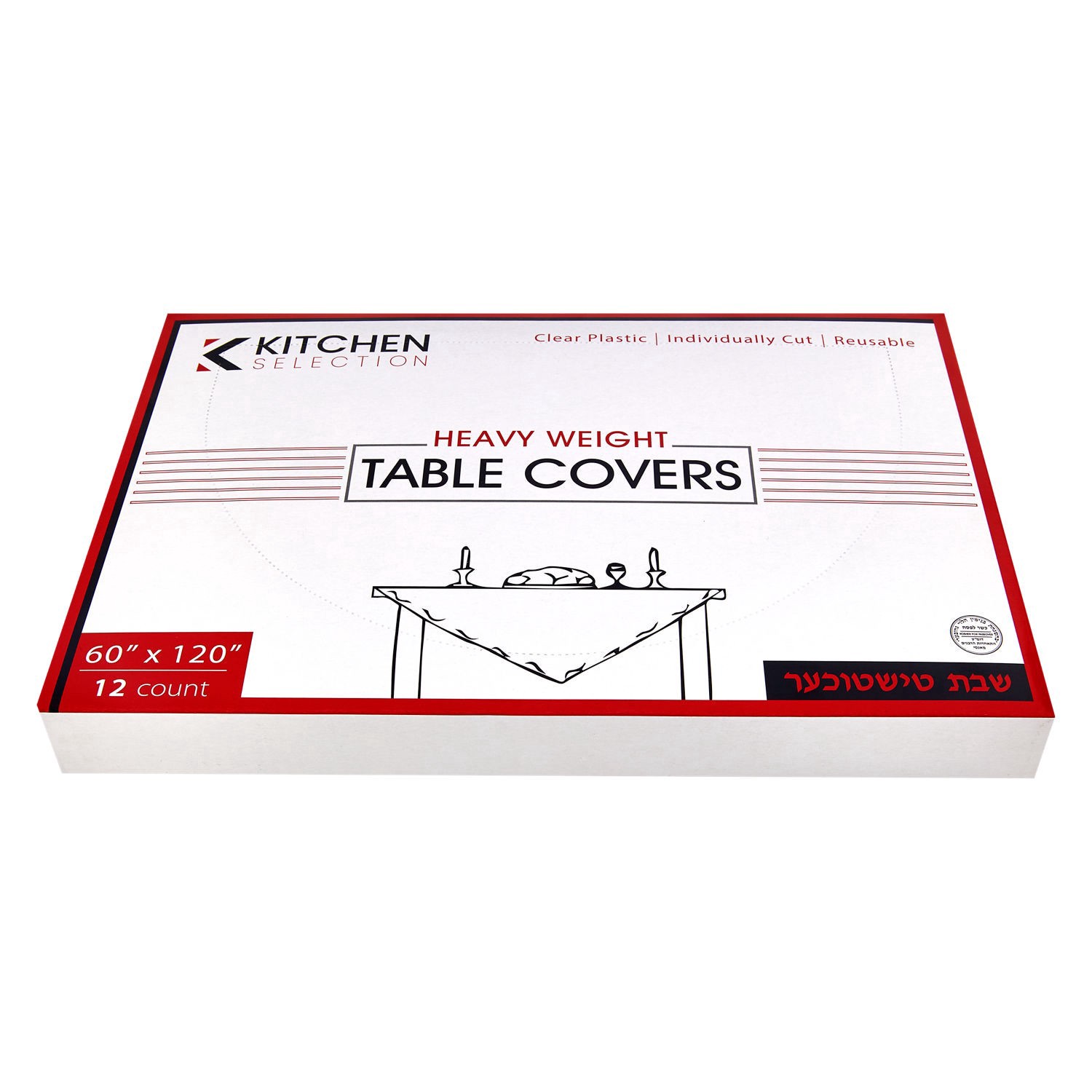 Sized 60" x 120", Kitchen Selection heavyweight clear plastic table covers are individually cut and reusable.