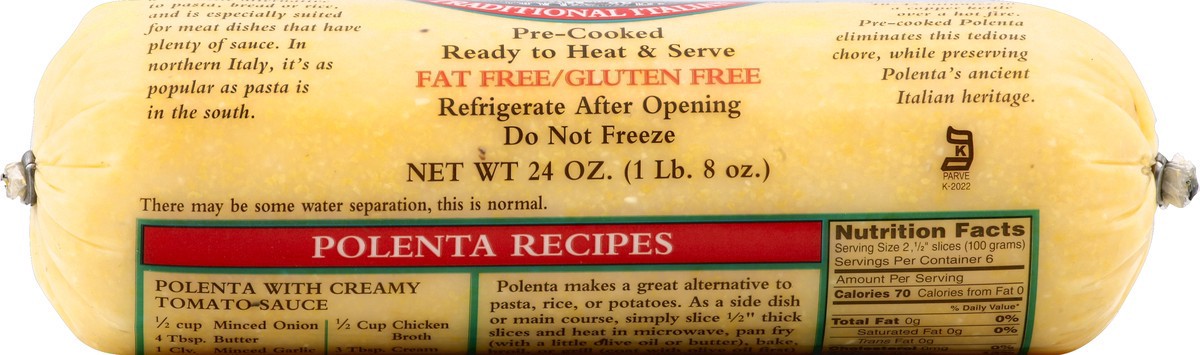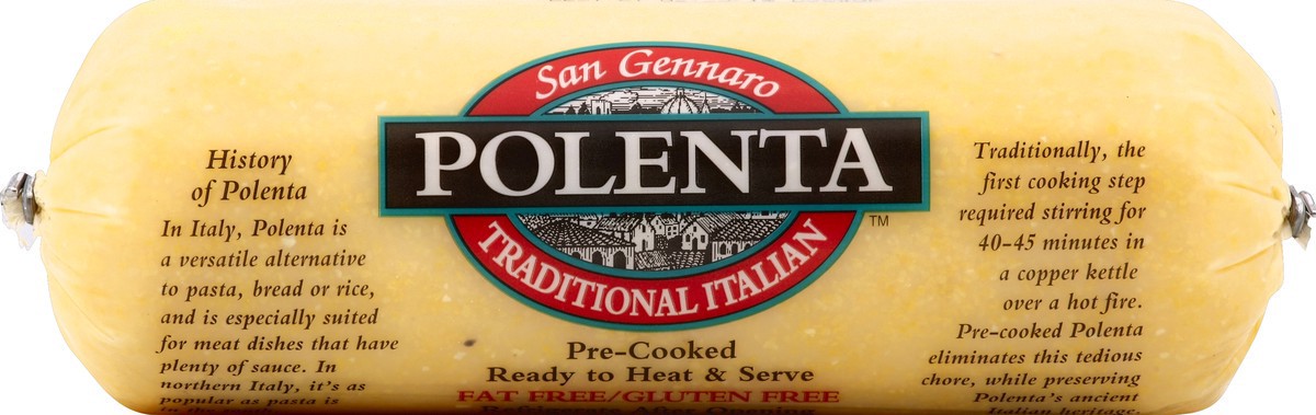 Pre-cooked. Ready to heat & serve. Fat free/Gluten free. History of Polenta: In Italy, Polenta is a versatile alternative to pasta, bread or rice, and is especially suited for meat dishes that have pl…