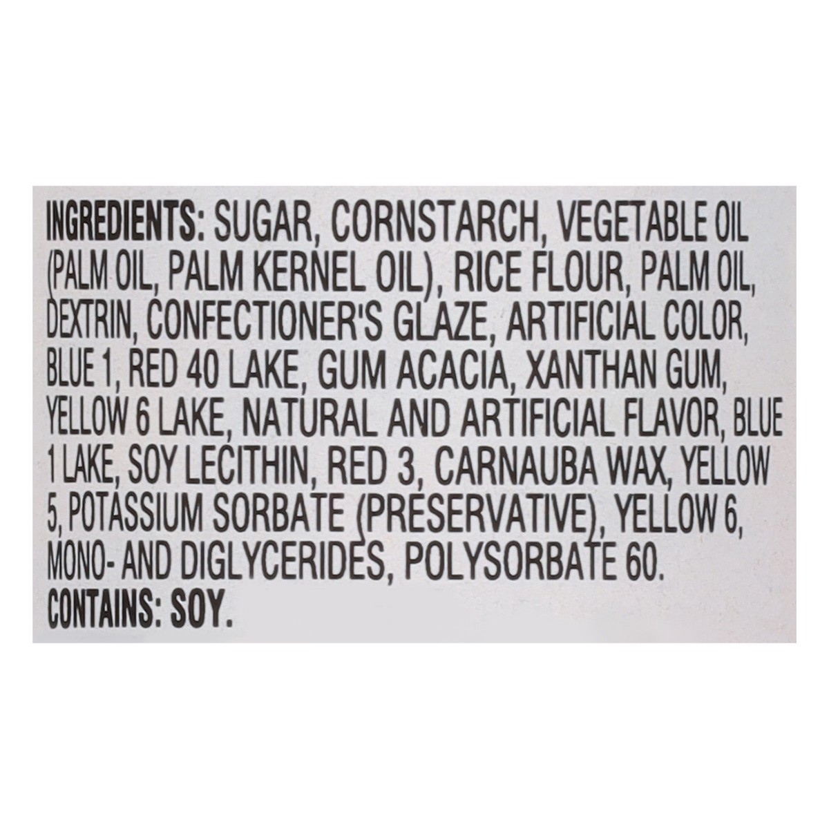 Sugar, Cornstarch, Vegetable Oil (Palm Oil, Palm Kernel Oil), Rice Flour, Palm Oil, Dextrin, Confectioner's Glaze, Artificial Color, Blue 1, Red 40 Lake, Gum Acacia, Xanthan Gum, Yellow 6 Lake, Natura…