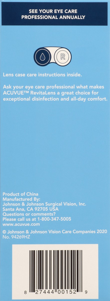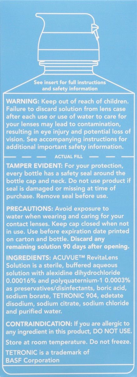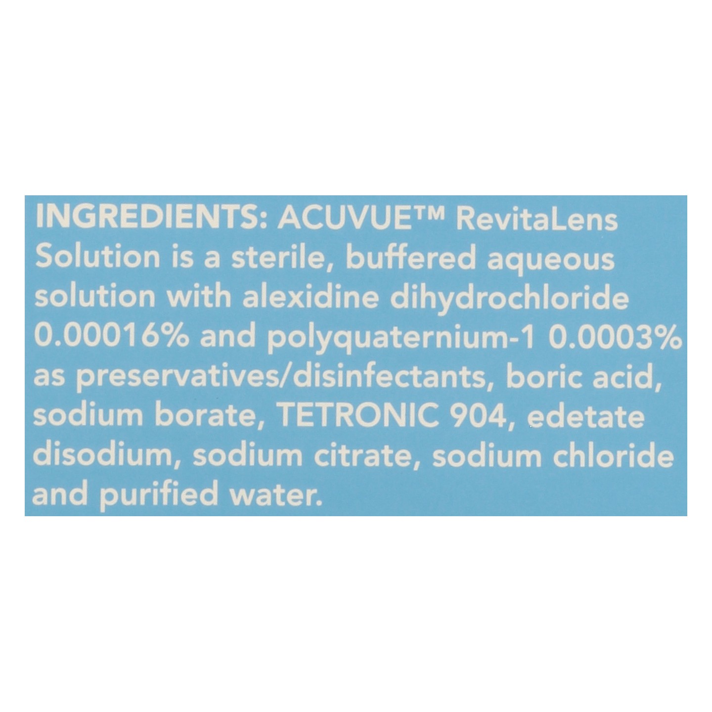 Acuvue Revitalens Solution is a Sterile, Buffered Aqueous Solution with Alexidine Dihydrochloride 0.00016% and Polyquaternium-1 0.0003% as Preservatives/Disinfectants, Boric Acid, Sodium Borate, Tetro…