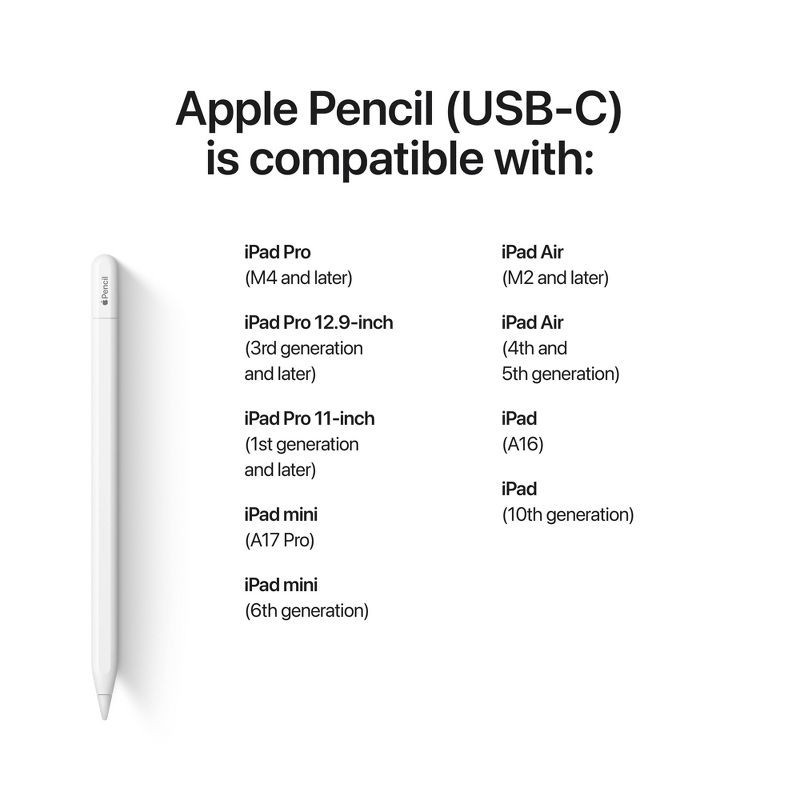 - EASY AND NATURAL—Write, sketch, and draw with pixel-perfect precision. Apple Pencil (USB-C) does it all with low latency and tilt sensitivity. Apple Pencil pairs and charges via USB-C and features a flat edge that attaches magnetically.