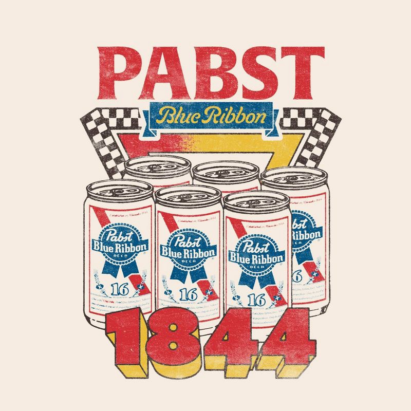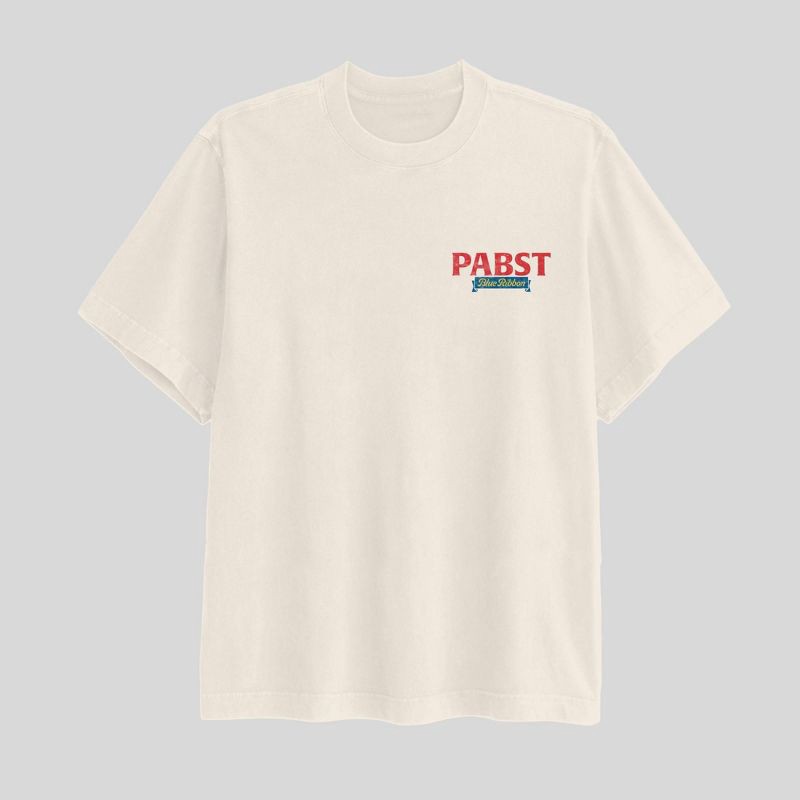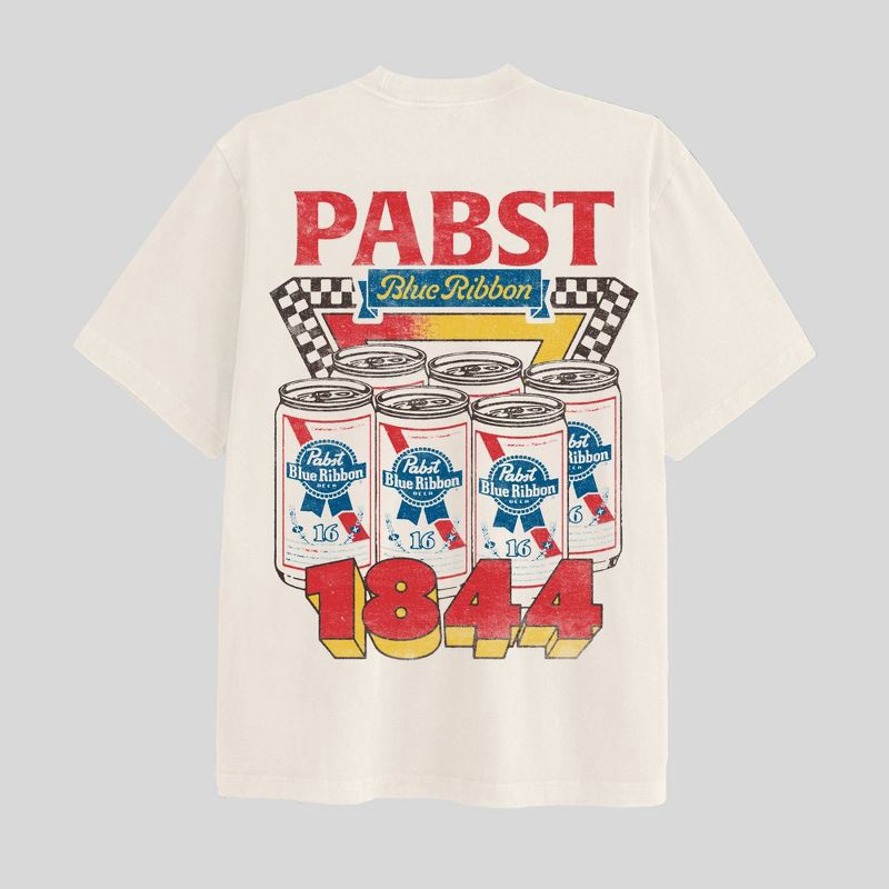 - Off-white color with Pabst Blue Ribbon logo on front and racing-themed PBR graphic with beer cans on back