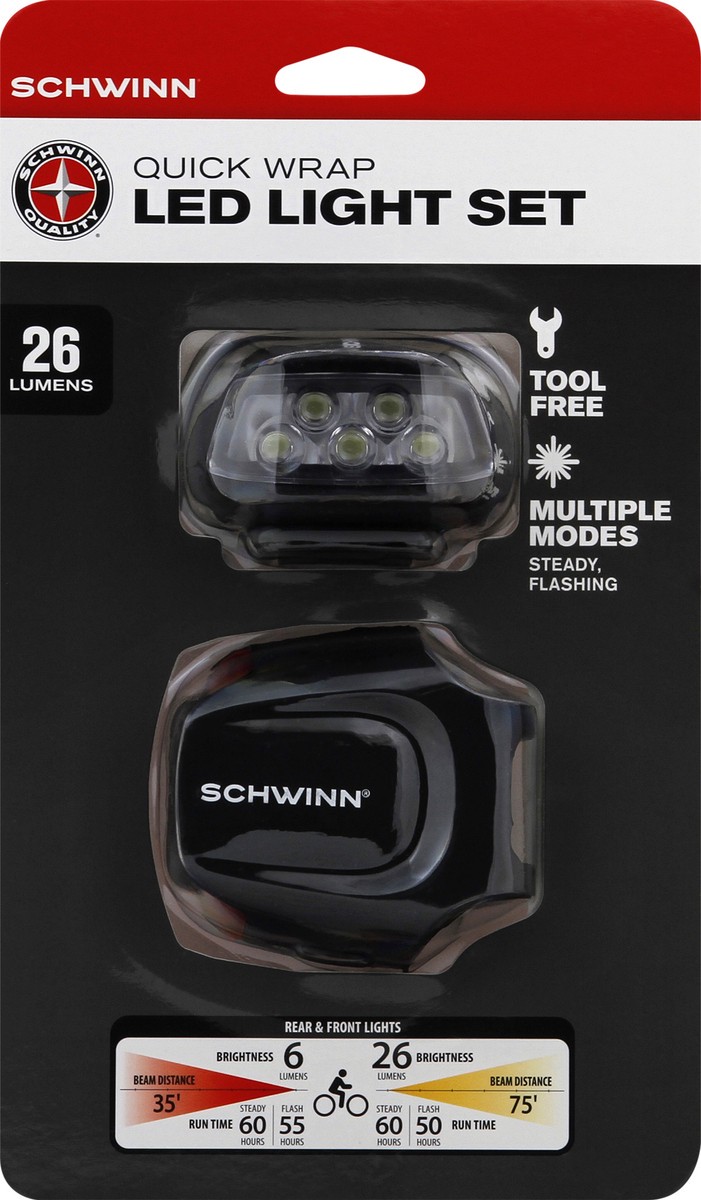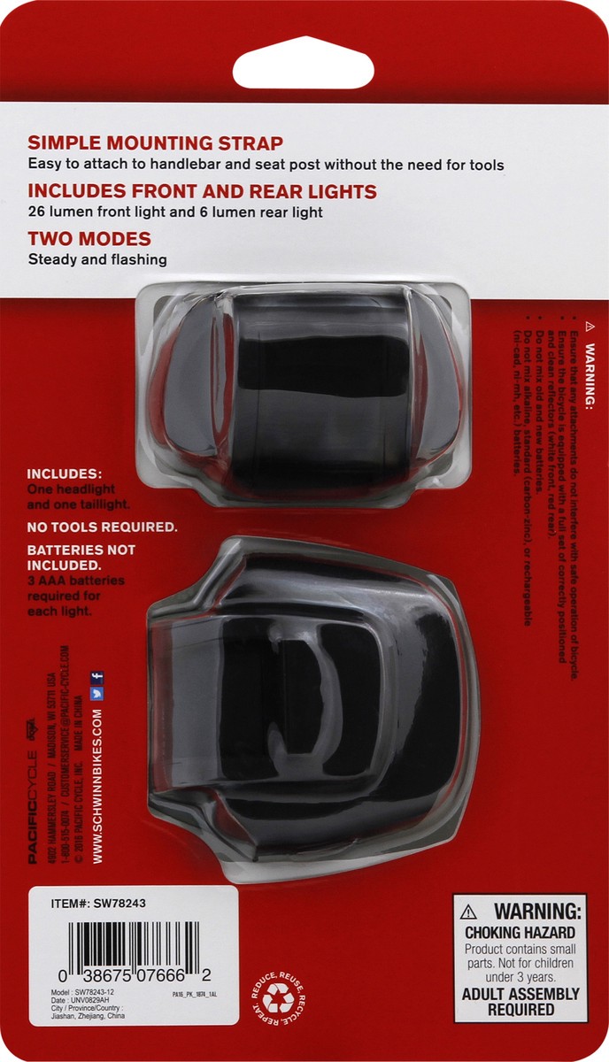 Model: SW78243. Rear & Front Lights: Rear: 6 lumens brightness; 35 ft beam distance; 60 hours steady run time; 55 hours flash. Front: 26 lumens brightness; 75 ft beam distance; 60 hours steady run tim…