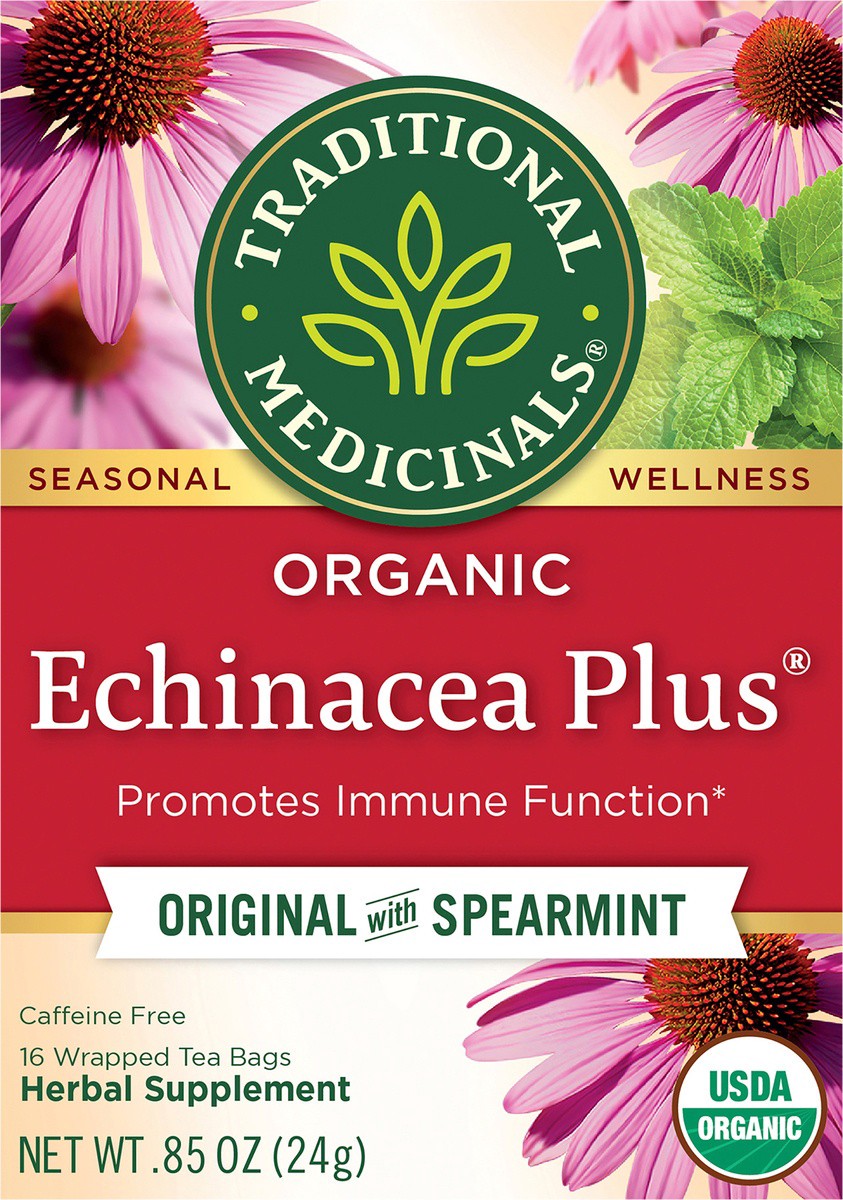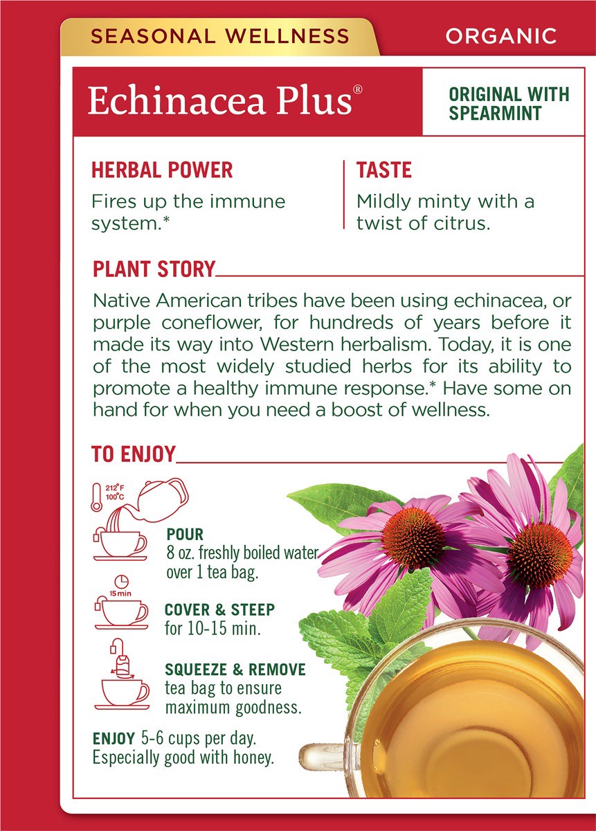 - HERBAL POWER: Fires up the immune system.*TASTE: Mildly minty with a twist of citrus.PLANT STORY:Echiancea is one of the most widely studied herbs for its ability to promote a healthy immune response.*USDA Certified Organic. Non-GMO Verified. Kosher. Caffeine Free. Certified B Corp. Compostable Tea Bags.Consistently high quality herbs from ethical trading partnerships.