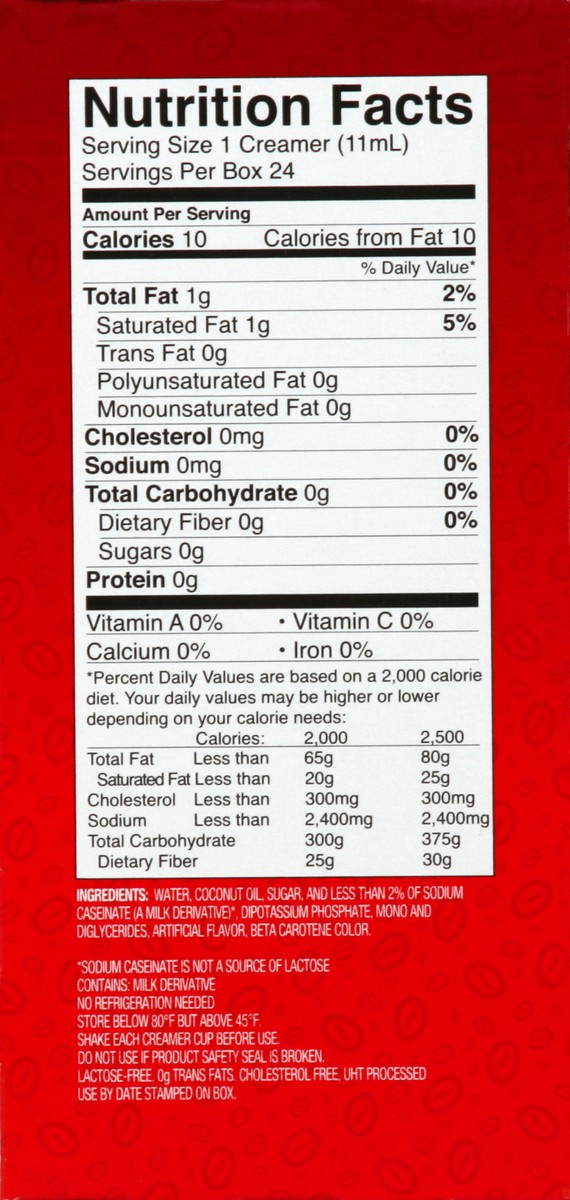 Water, Coconut Oil, Sugar, and Less than 2% of Sodium Caseinate (a Milk Derivative) (Sodium Caseinate is Not a Source of Lactose), Dipotassium Phosphate, Mono and Diglycerides, Artificial Flavor, Beta…