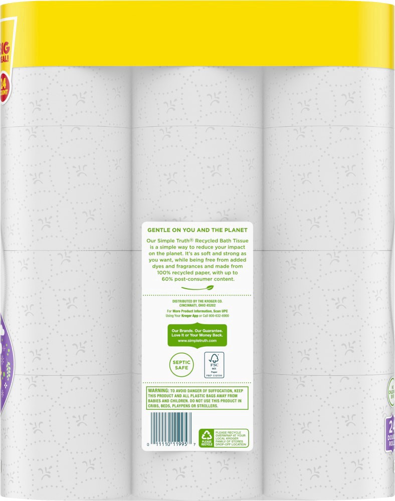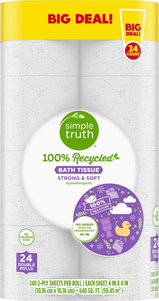 Simple Truth® Toilet Paper 100% Recycled Double Roll BIG DEAL! eases the impact on our planet yet retains strength and softness. Expertly crafted from 100% recycled paper, it boasts up to 60% post-con…