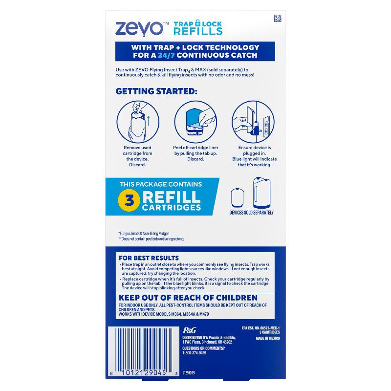 - Continuous Protection: Includes 3 refill cartridges compatible with Zevo Full Size and Zevo Max Flying Insect Traps