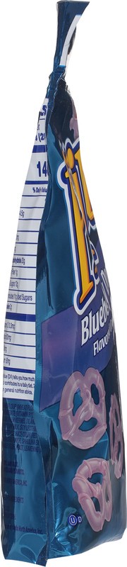 Crispy pretzels wrapped in blueberry flavored confection for a sweet snack on the go
