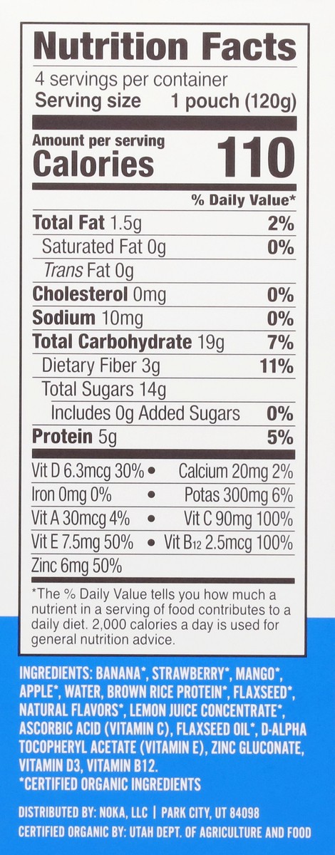 Organic Banana, Organic Strawberry, Organic Mango, Organic Apple, Water, Organic Brown Rice Protein, Organic Flax Seeds, Organic Lemon Juice Concentrate, Ascorbic Acid (Vitamin C), Organic Flax Seed O…