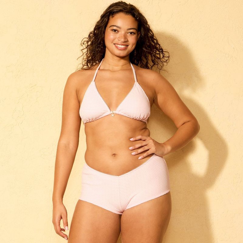 Pull-on boyshort bikini bottom from Wild Fable™ with a pink textured stripe pattern. Made from a fabric blend of recycled polyester, nylon and spandex with full lining for flexible comfort in and out …