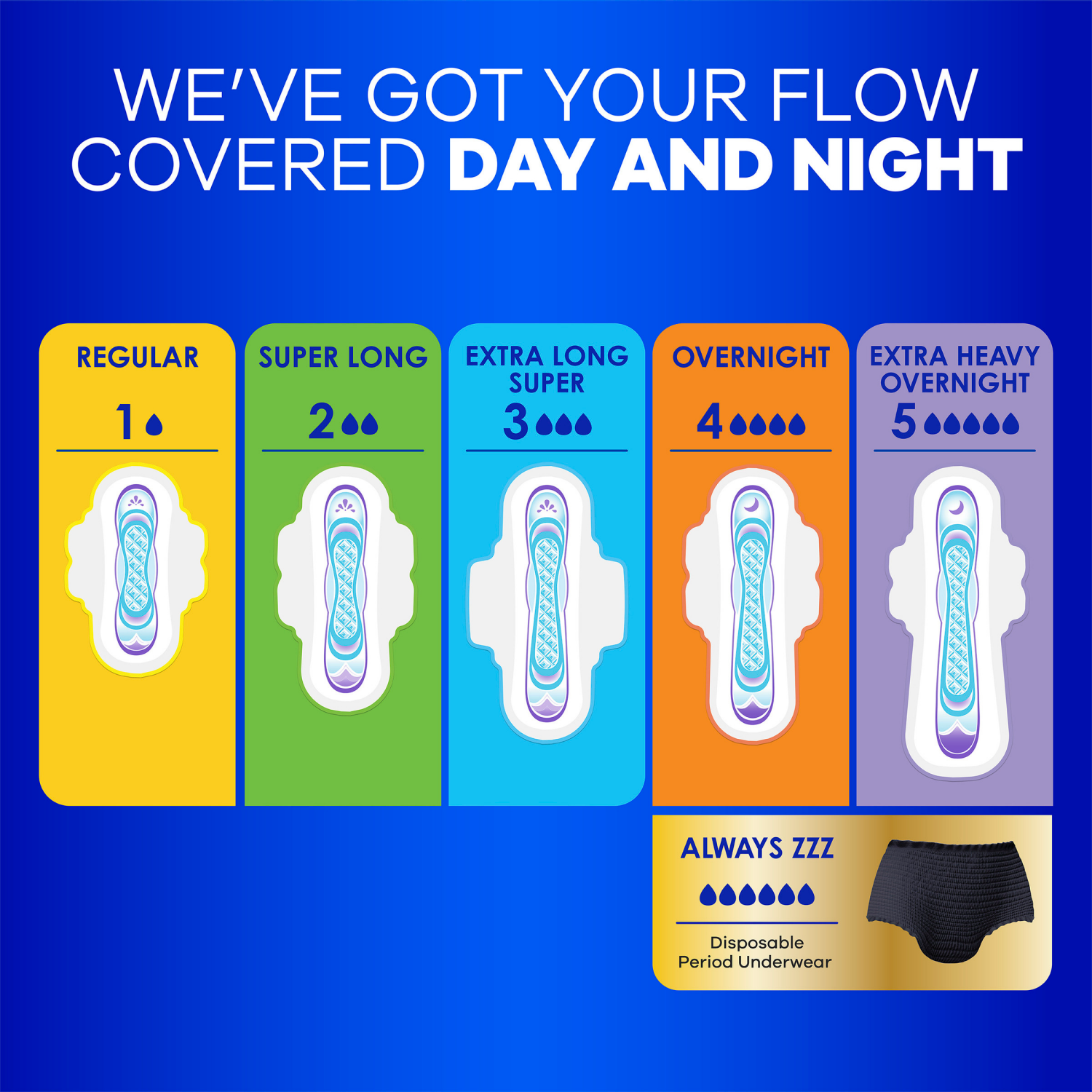 RapidDry. OdorLock. LeakGuard. Up to 100% leak-free comfort. 3+ month pack (based on average U.S consumer usage). For fewer leaks: Step up in size. Flow: Size 1: Light/Moderate. Great for day. 1: Rapi…