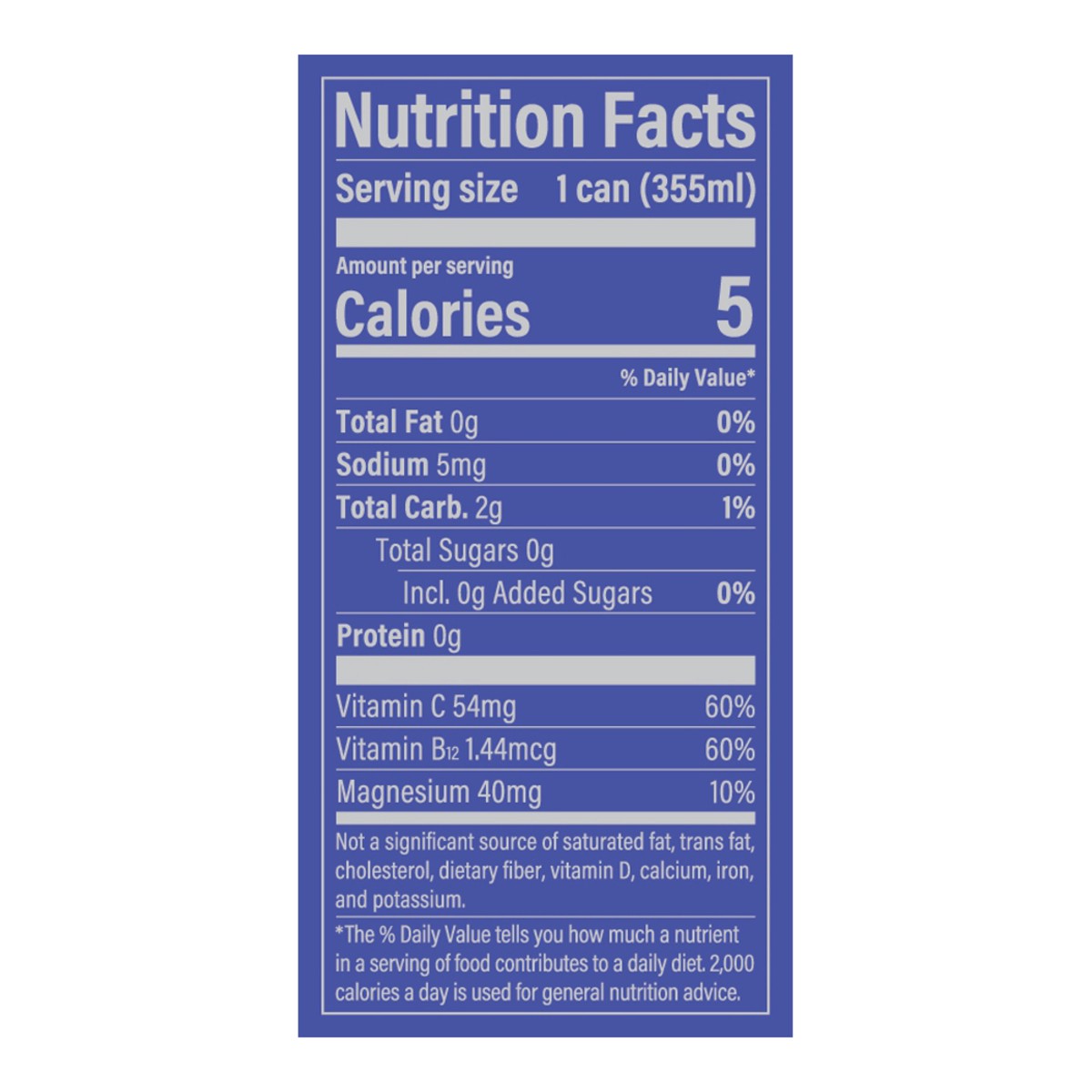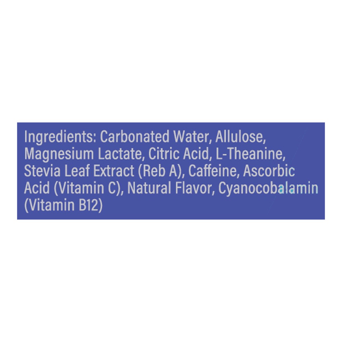 Carbonated Water, Allulose, Magnesium Lactate, Citric Acid, L-Theanine, Stevia Leaf Extract (Reb A), Caffeine, Ascorbic Acid (Vitamin C), Natural Flavor, Cyanocobalamin (Vitamin B12).