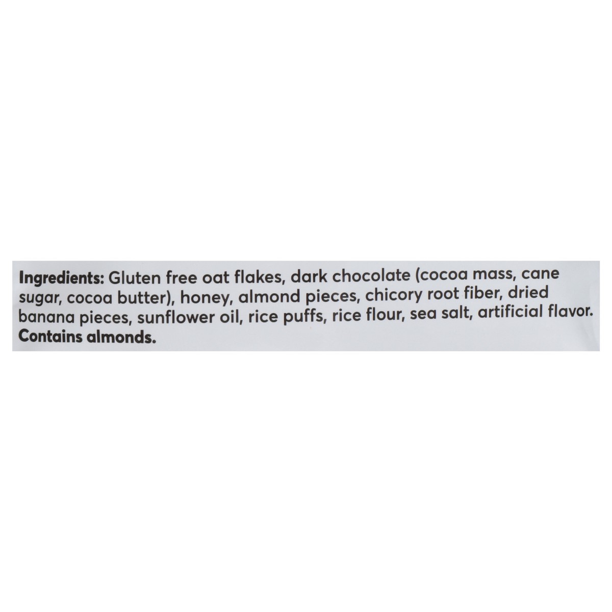 Gluten Free Oat Flakes, Dark Chocolate (Cocoa Mass, Cane Sugar, Cocoa Butter), Honey, Almond Pieces, Chicory Root Fiber, Dried Banana Pieces, Sunflower Oil, Rice Puffs, Rice Flour, Sea Salt, Artificia…