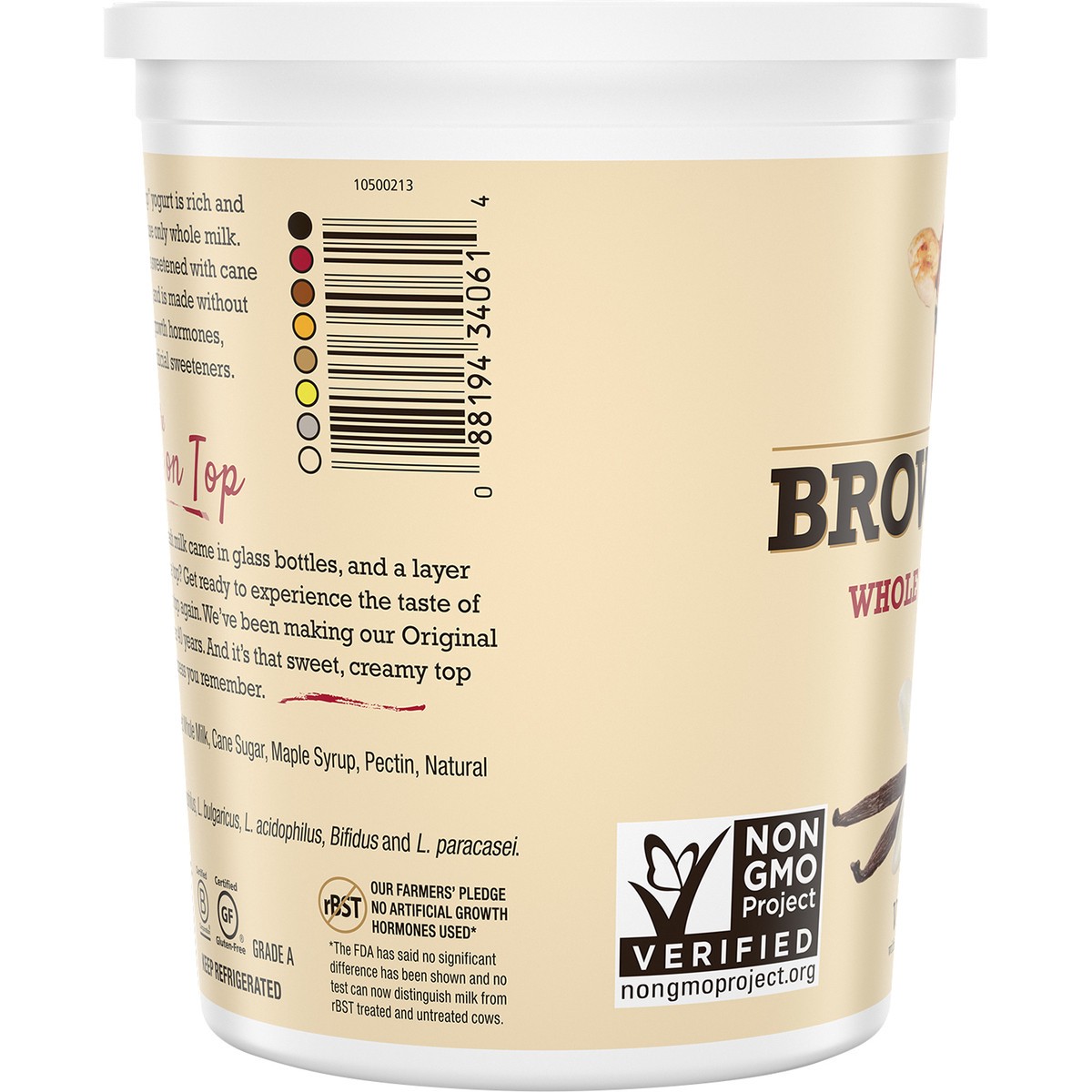 - NON-GMO PROJECT VERIFIED. Our Brown Cow 32 ounce yogurt is Non-GMO Project Verified, Kosher, Halal, gluten free and made without the use of artificial growth hormones, artificial flavors, or artificial sweeteners.