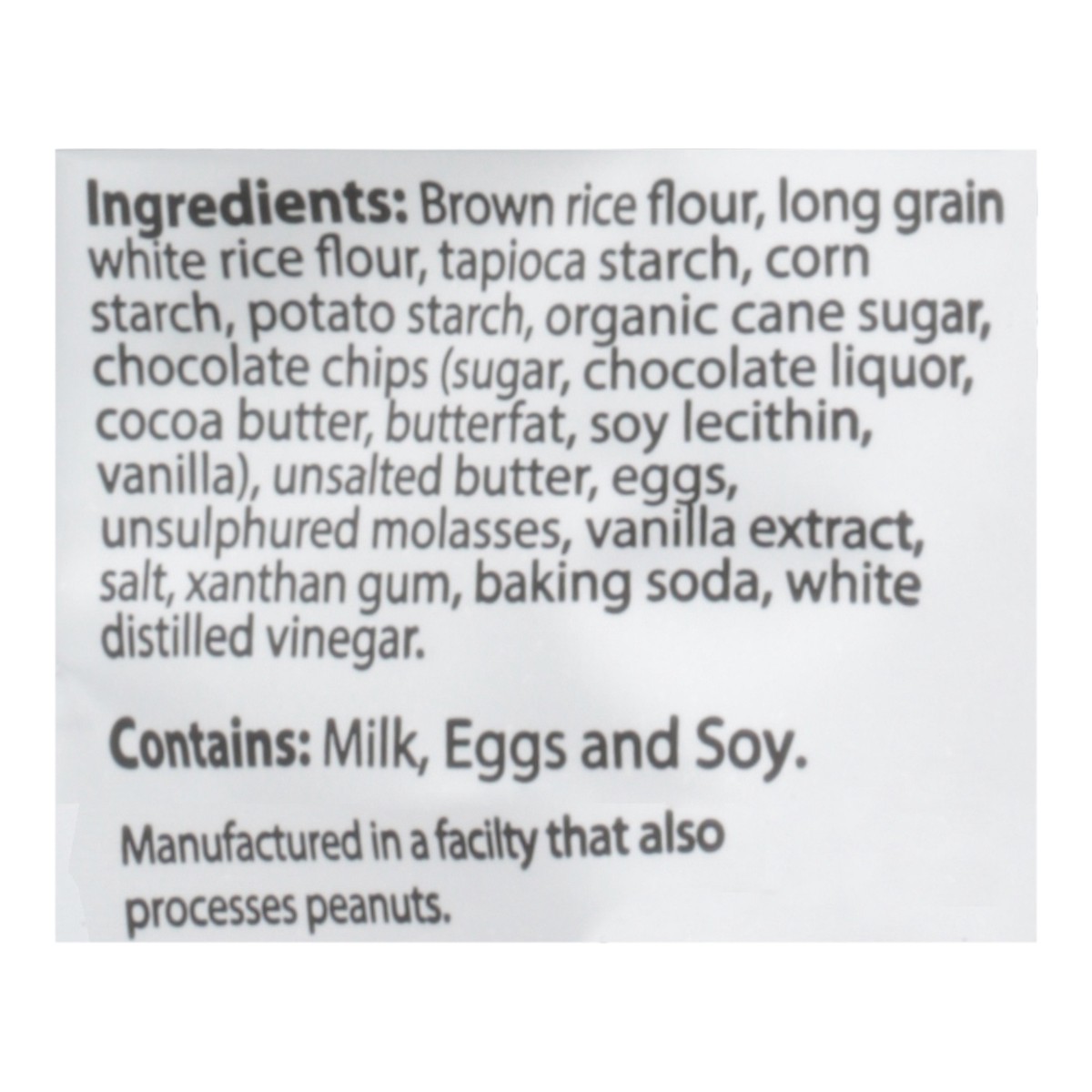 Brown Rice Flour, Long Grain White Rice Flour , Tapioca Starch, Corn Starch, Potato Starch, Organic Cane Sugar, Chocolate Chips (Sugar, Chocolate Liquor, Cocoa Butter, Butterfat, Soy Lecithin, Vanilla…