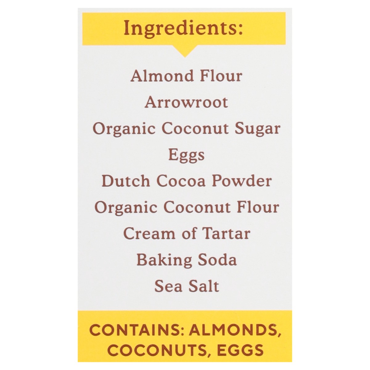 Almond Flour, Arrowroot, Organic Coconut Sugar, Eggs, Dutch Cocoa Powder, Organic Coconut Flour, Cream of Tartar, Baking Soda, Sea Salt.