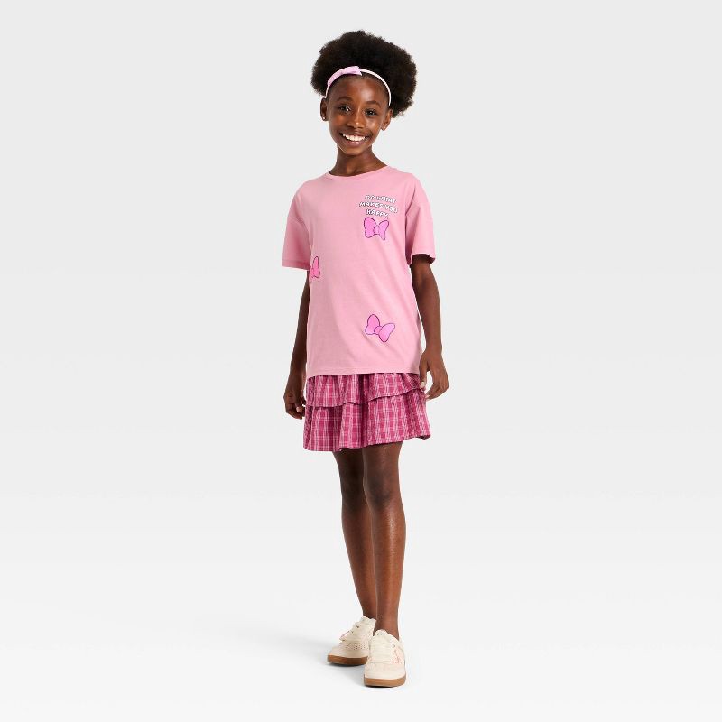 Add playful Disney charm to her wardrobe with this Girls' Minnie Mouse Oversized Front and Back Graphic Short Sleeve T-Shirt in pink. Made from soft, breathable cotton-blend fabric, it keeps her cool …